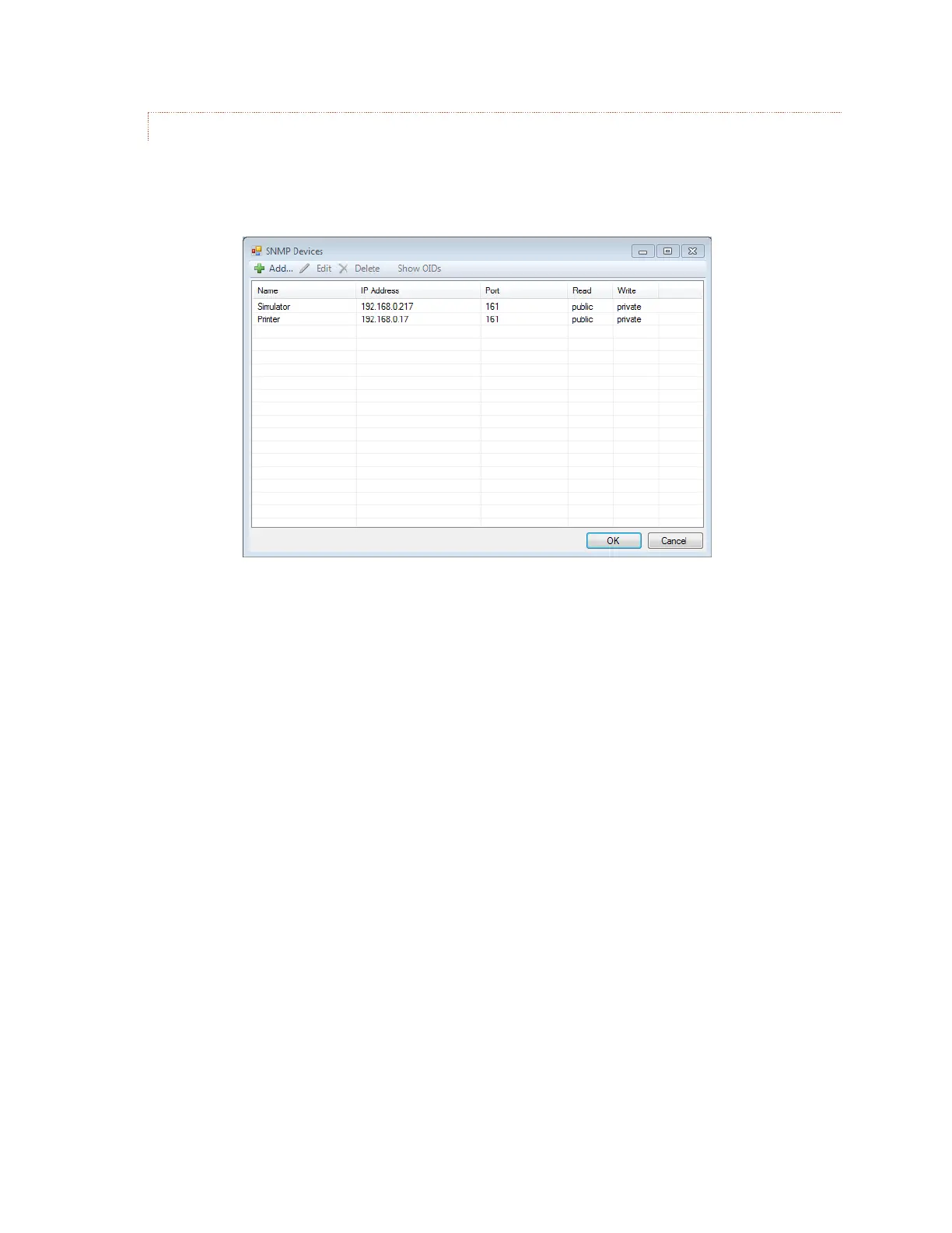 select SNMP Devices… from the Edit menu. The SNMP Devices dialog box will be displayed as shown below.