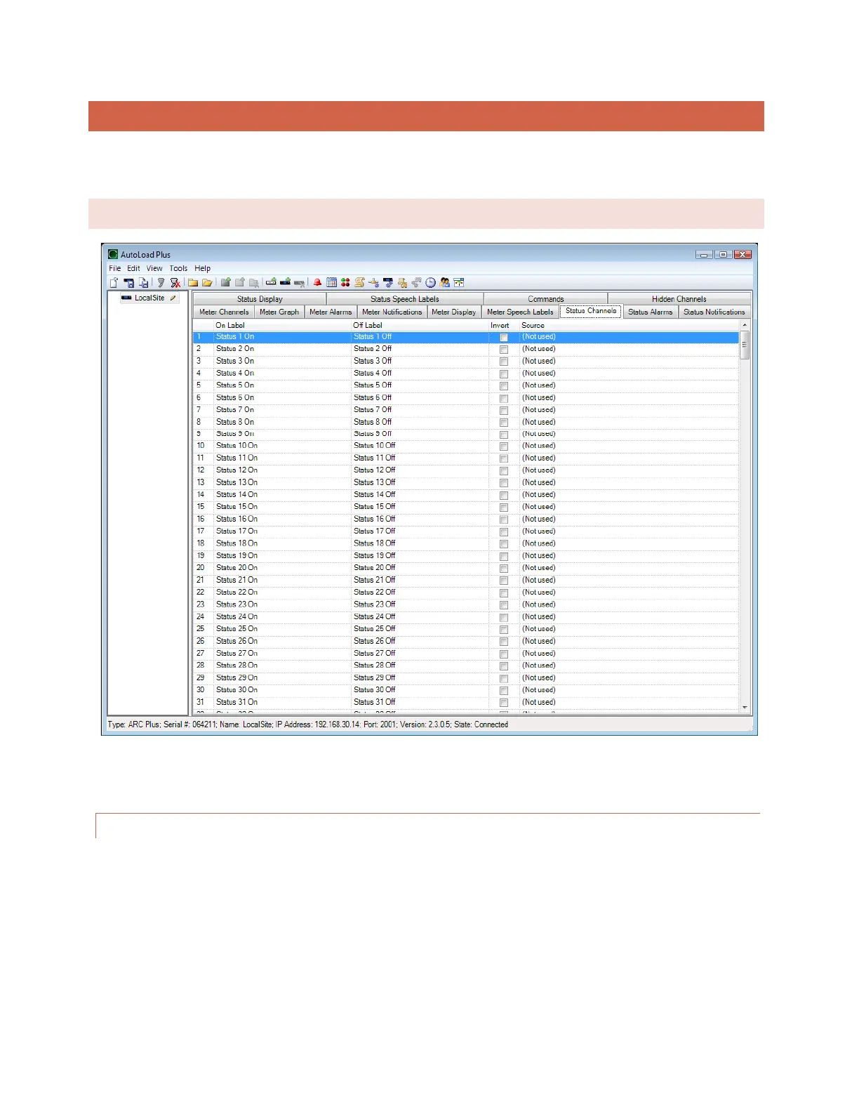 Configuration for the ARC Plus status channels is broken out into several tabs in the main display area of AutoLoad