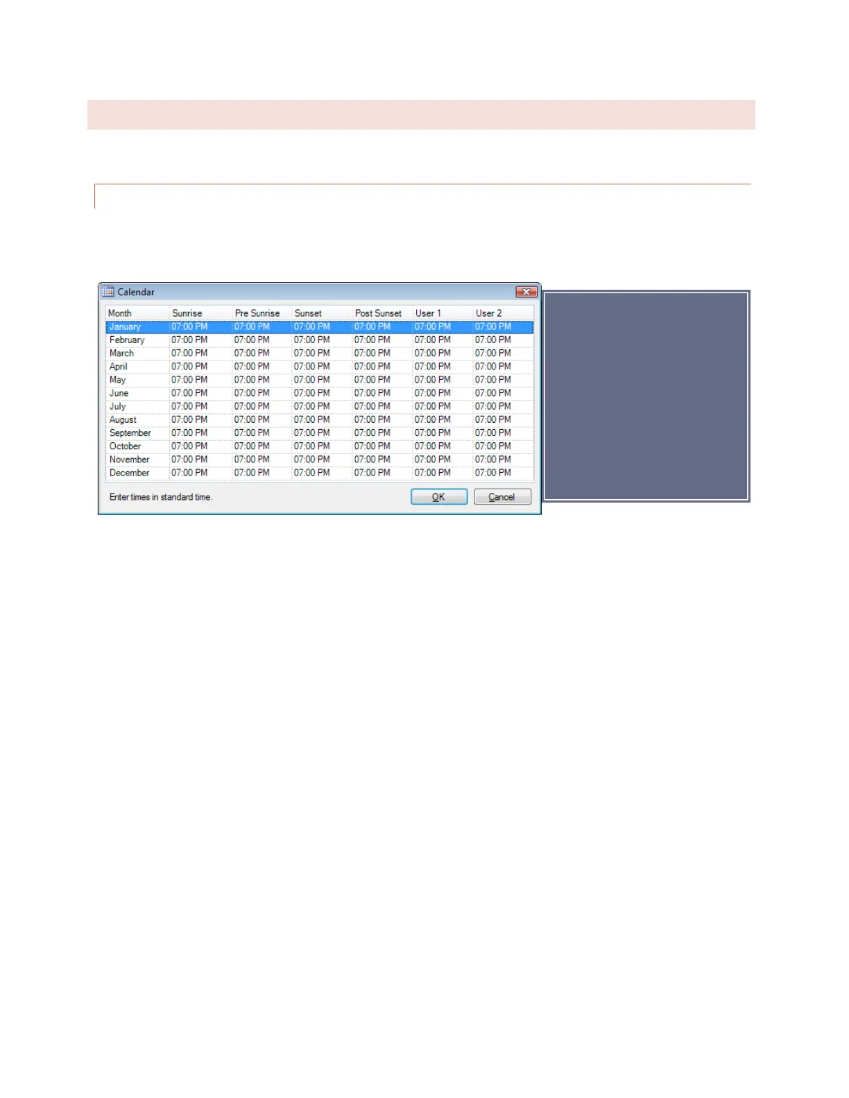 The Calendar allows six preset times of day, per month (Pre Sunrise, Sunrise, Sunset, Post Sunset, User 1 and User