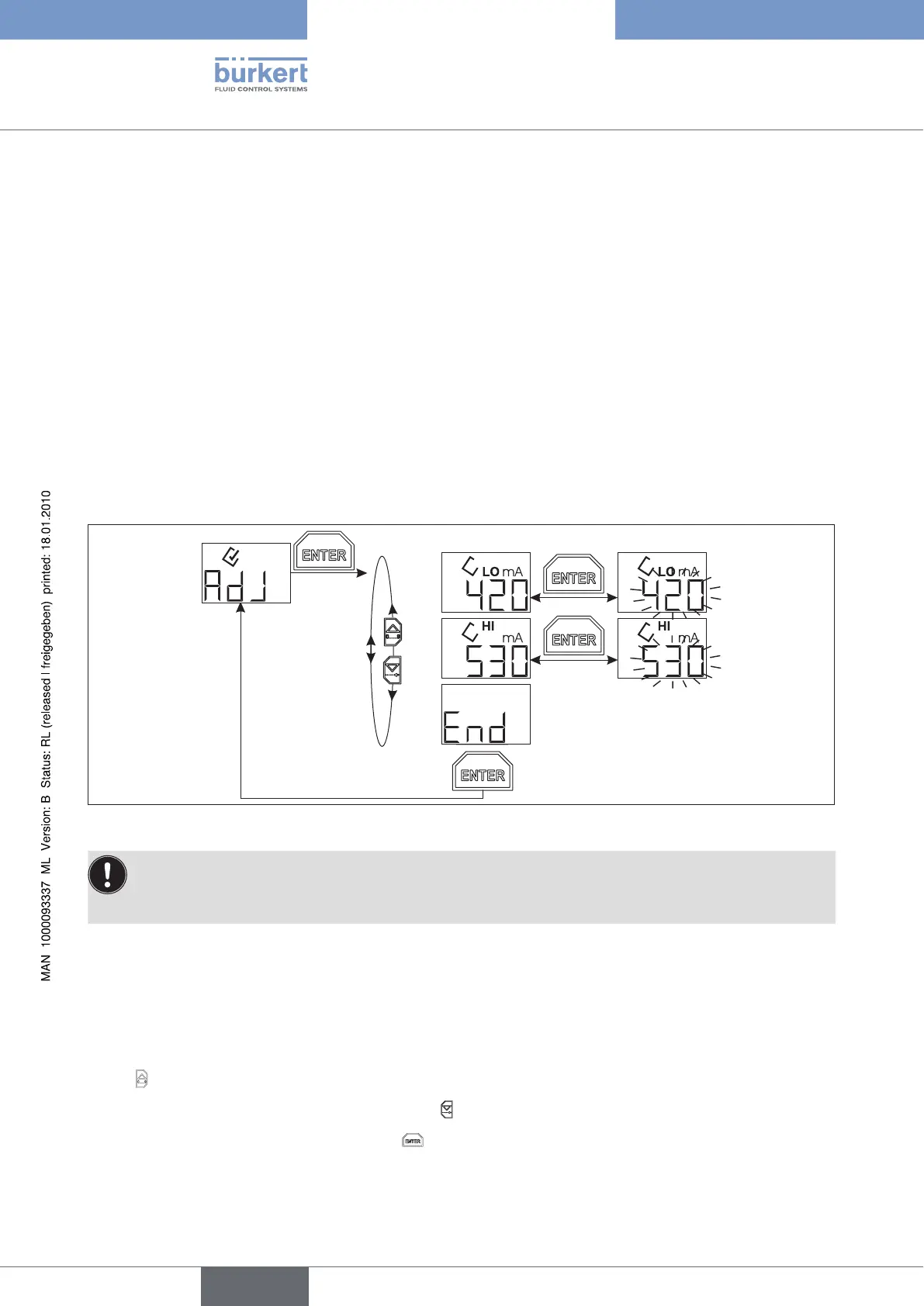(AdJ = LO mA) via the arrow keys so that the valve just starts to open.