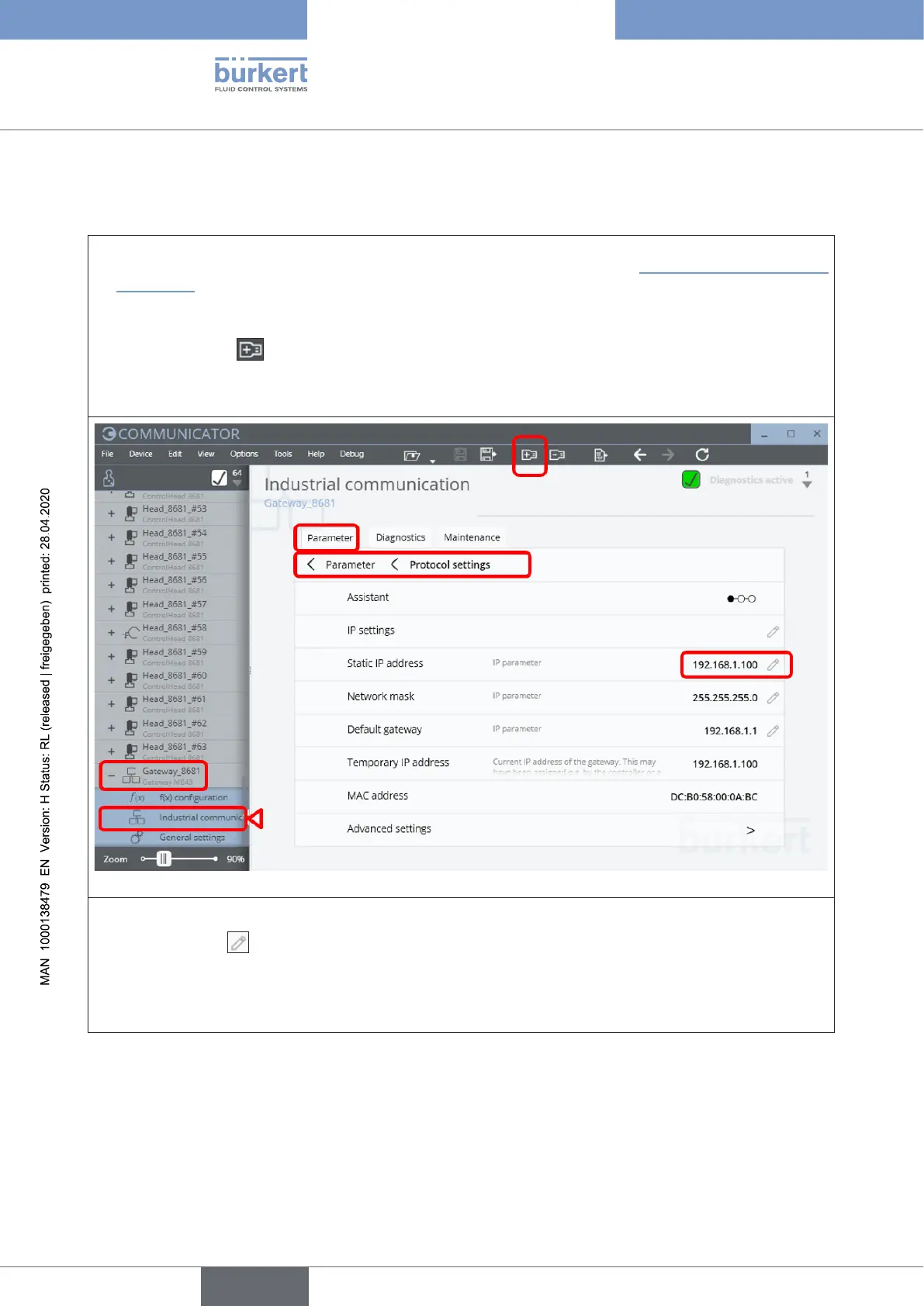 15.15.2 Changing the gateway IP address using “Bürkert