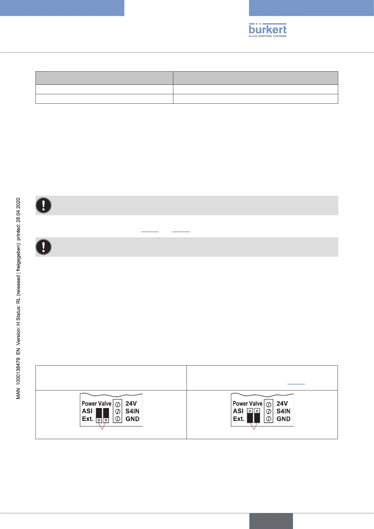 Fig. 22: Jumper settings for power supply via AS interface or for external power supply