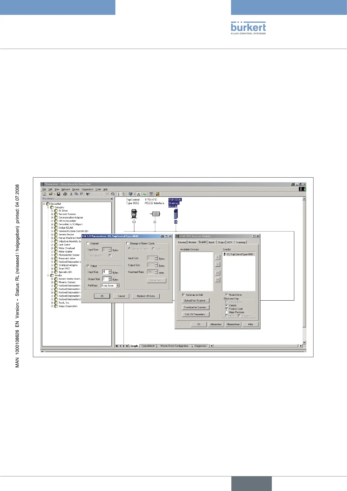 First of all the scan list of the DeviceNet master/scanner is set up. To do this, the devices listed in the left part of the correspond-