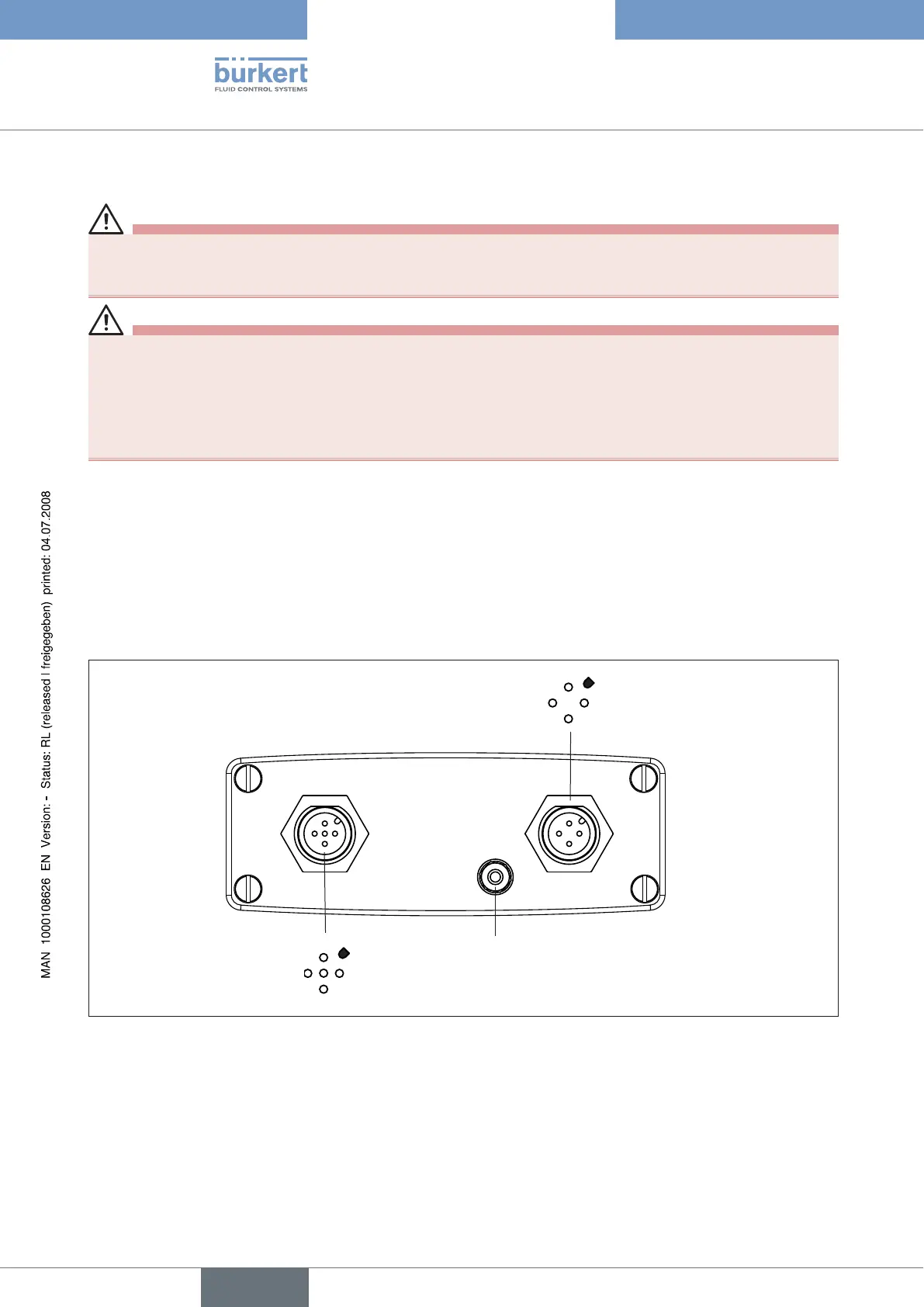 For operation of the device always connect the 5-pole (bus) and the 4-pole M12 round plug (power supply).