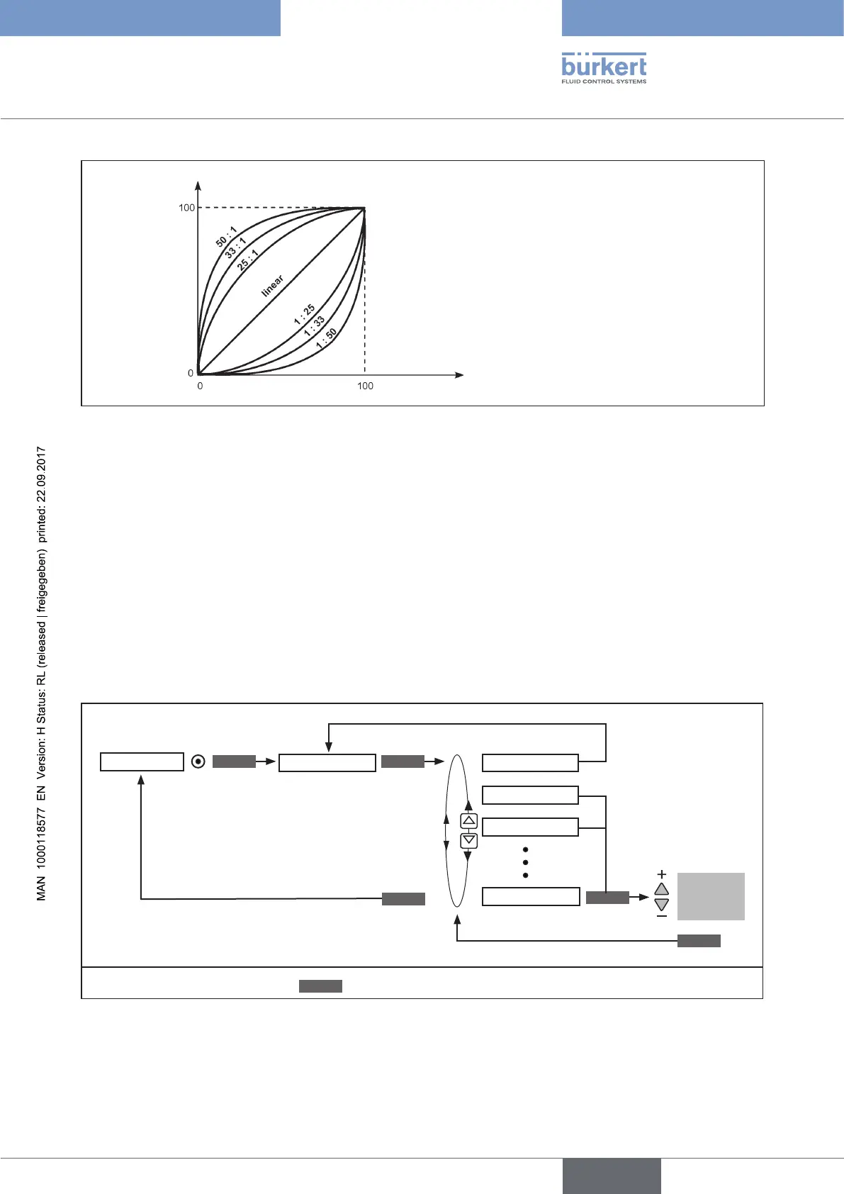 Equal percentage characteristics 1:25, 1:33, 1:50, 25:1, 33:1 and 50:1 and a linear characteristic can be set.