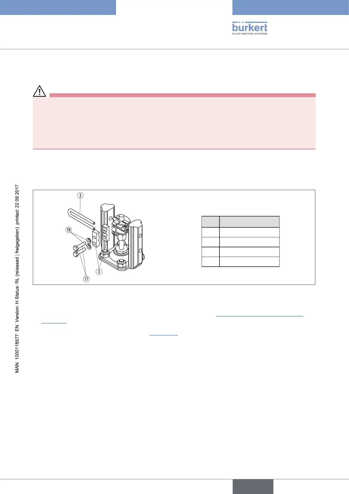 → Using the clamping pieces ③, hexagon bolts ⑰ and circlips ⑯ attach the hoop ② to the actuator spindle.