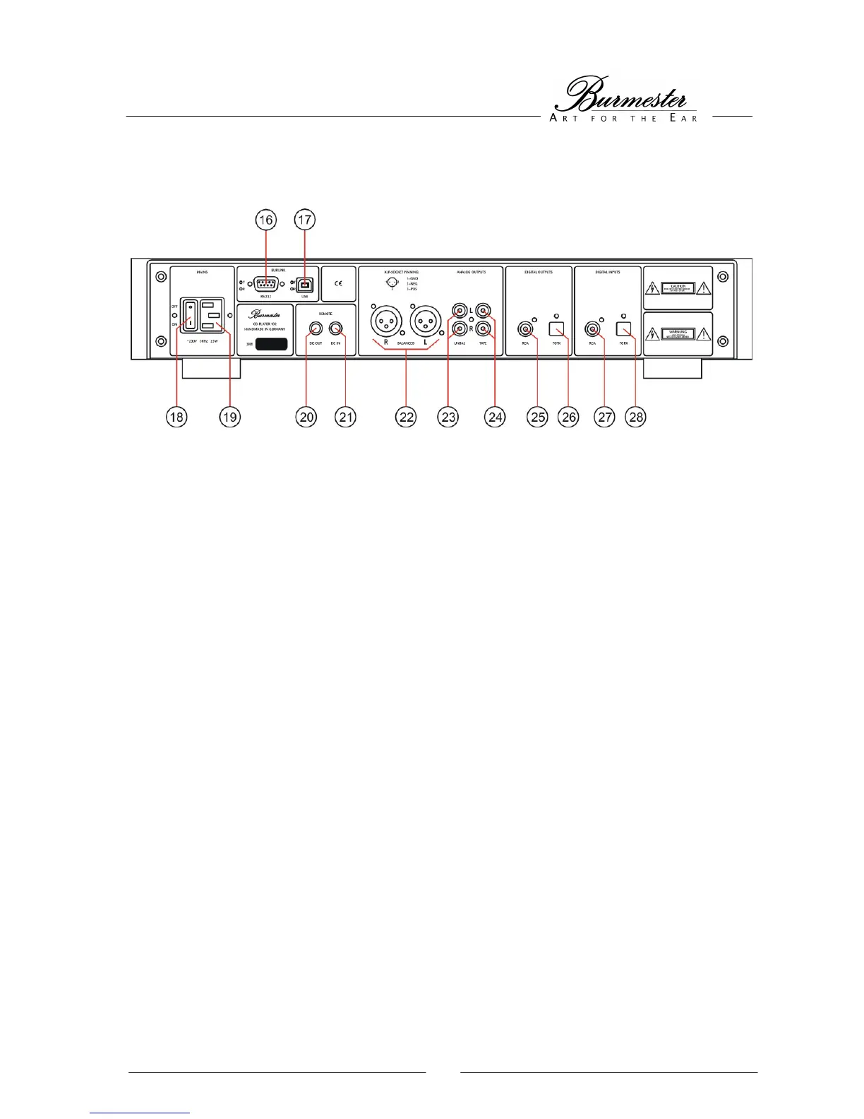 (16) BURLINK interface RS-232 with check LEDs (23) Analog audio output (unbalanced)