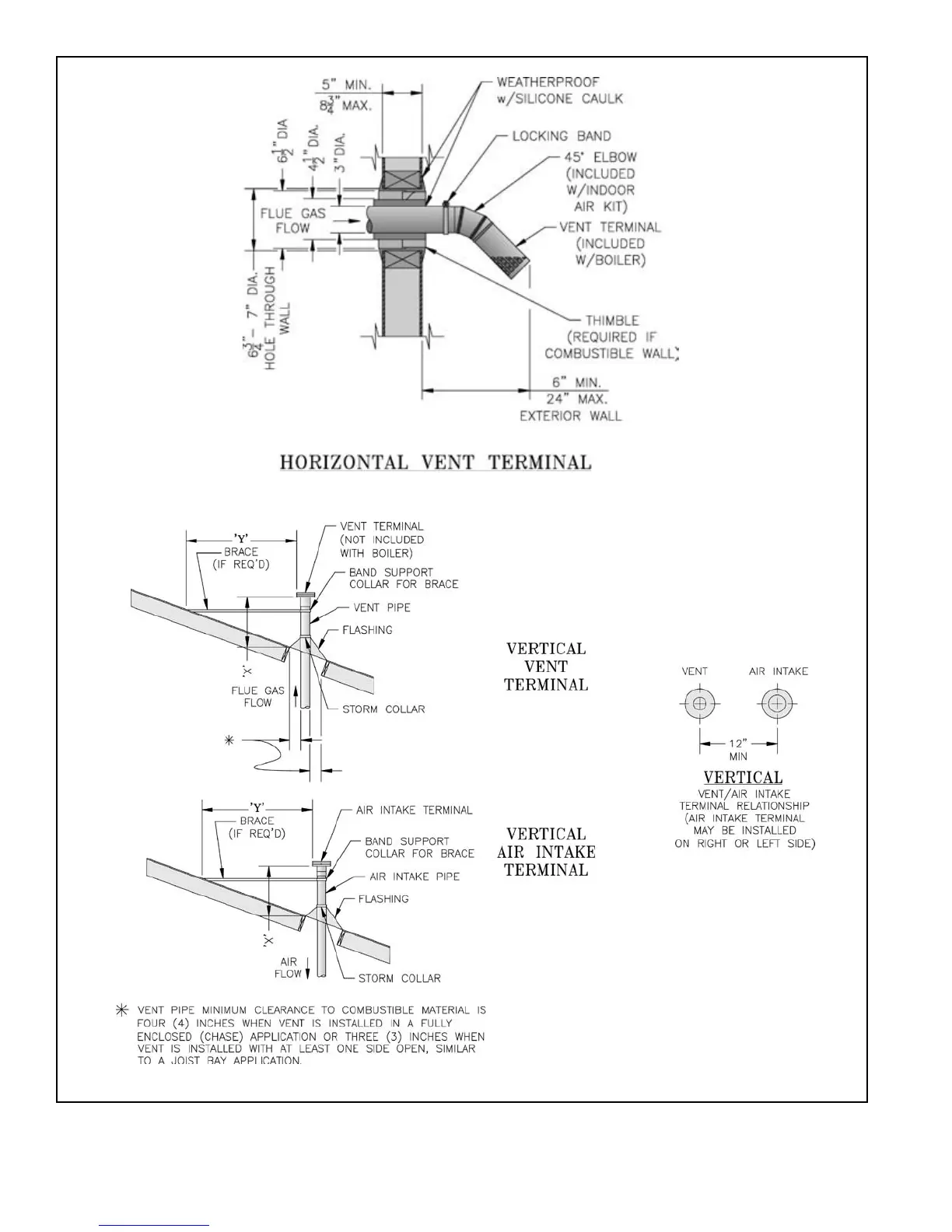 Extend Vent/Air Intake Piping to maintain minimum vertical (“X”) and minimum horizontal (“Y”) distance of twelve