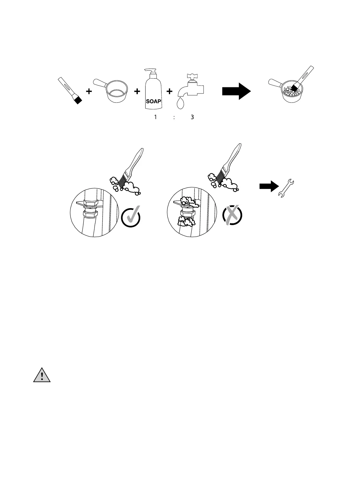 • Open the gas cylinder valve. Bubbles will appear on all leaking points.