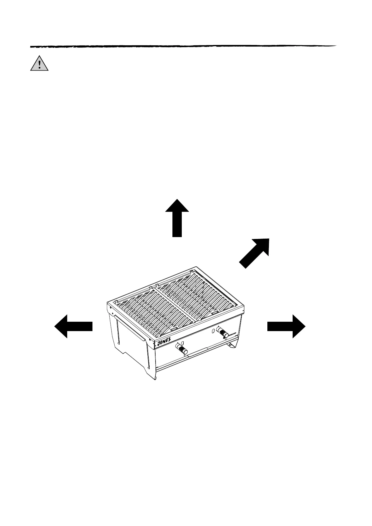 ATTENTION: The grill radiates heat. Never place the grill directly in front of glass surfaces, walls, plants,