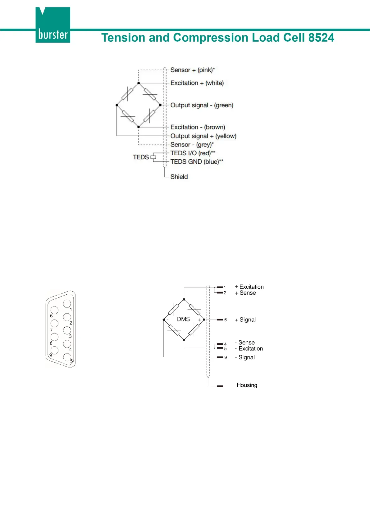Connection to burster devices with 9-pin D-sub socket with 6-wire system