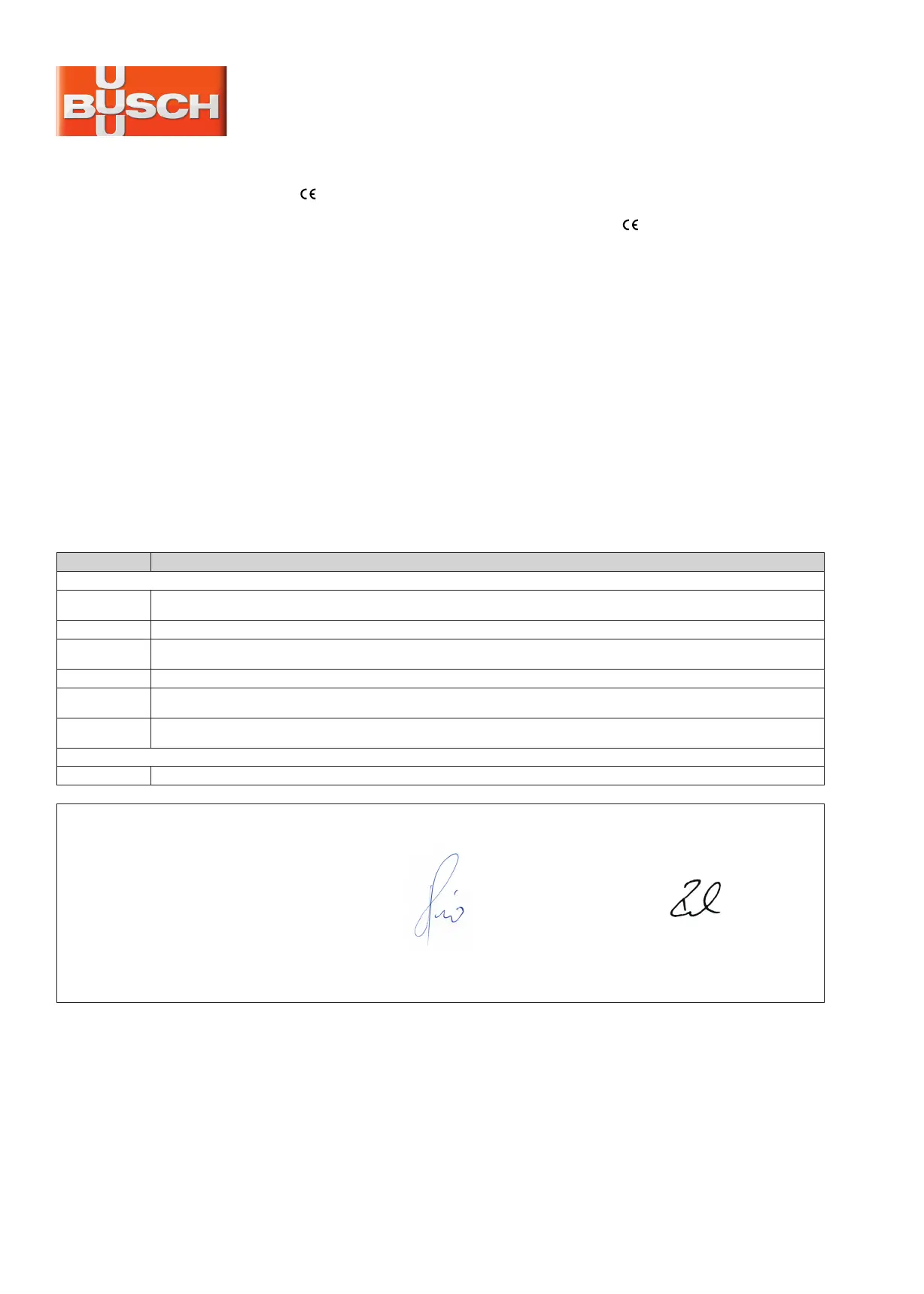 NOTE: This De cla ra tion of Con for mi ty and the -mark af fixed to the na me plate are va lid for the va cuum pump wi thin the Busch-scope of de li ve ry.