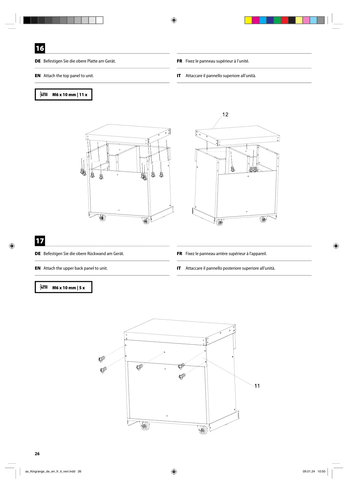 DE Befestigen Sie die obere Platte am Gerät. FR Fixez le panneau supérieur à l’unité.