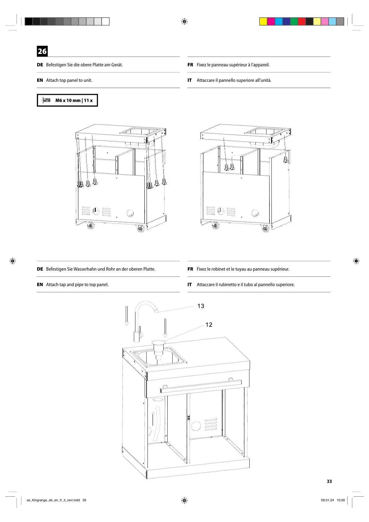 DE Befestigen Sie die obere Platte am Gerät. FR Fixez le panneau supérieur à l’appareil.