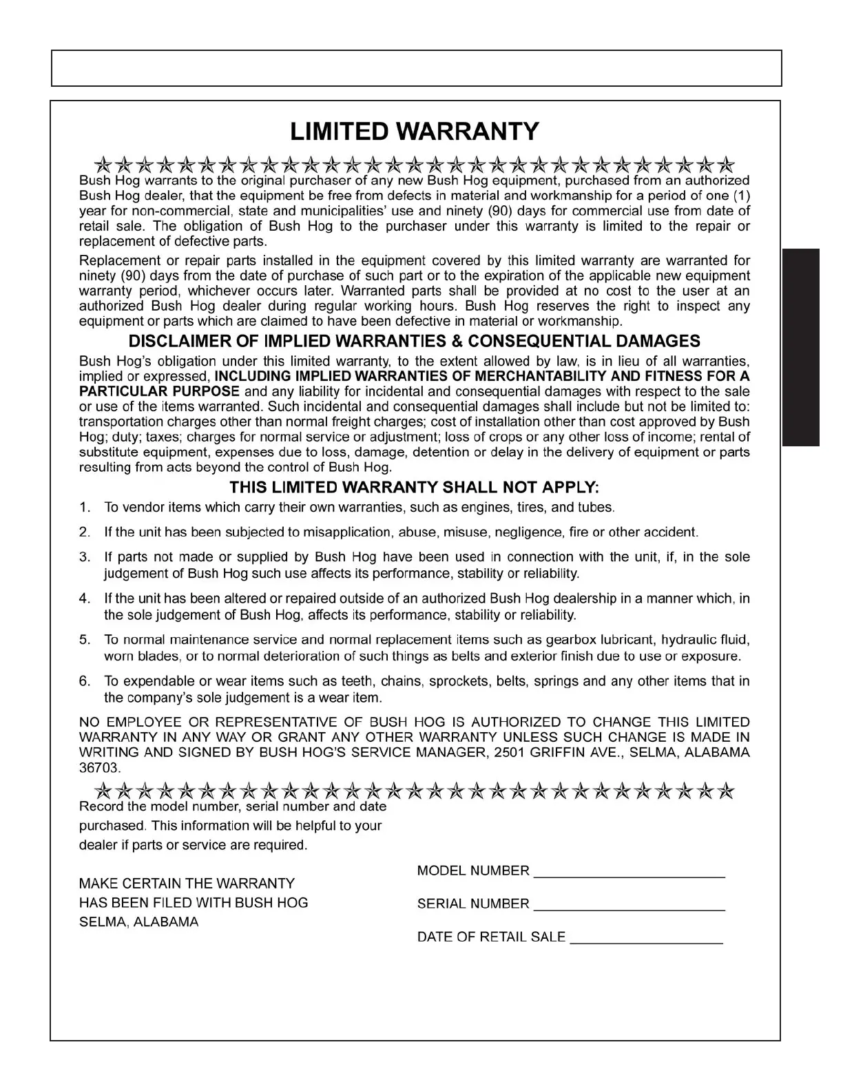 Bush Hog HDTH8 - INTRODUCTION; LIMITED WARRANTY