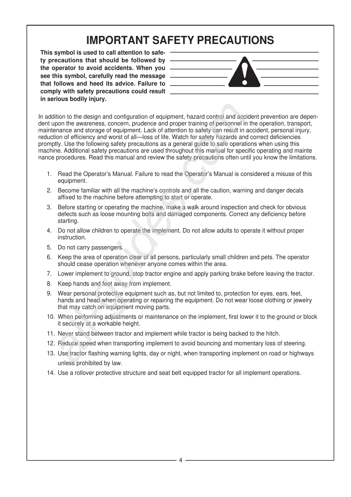 14. Use a rollover protective structure and seat belt equipped tractor for all implement operations.