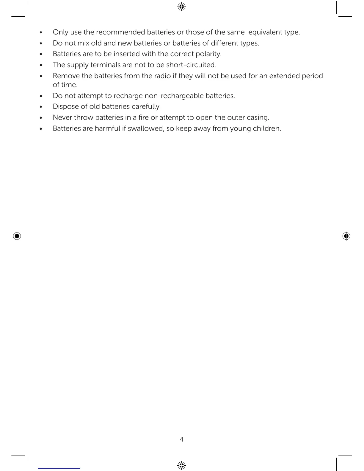 • Remove the batteries from the radio if they will not be used for an extended period