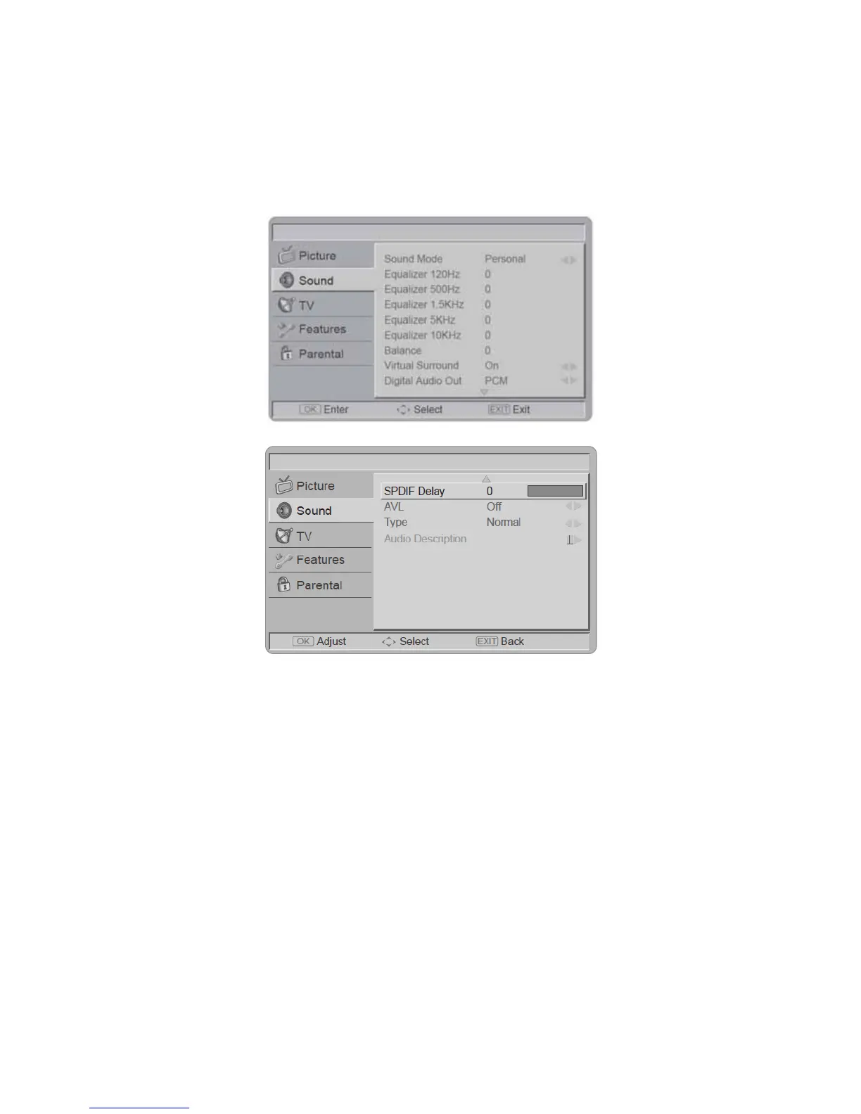 The Sound menu provides audio adjustment for user to modify the audio setting.