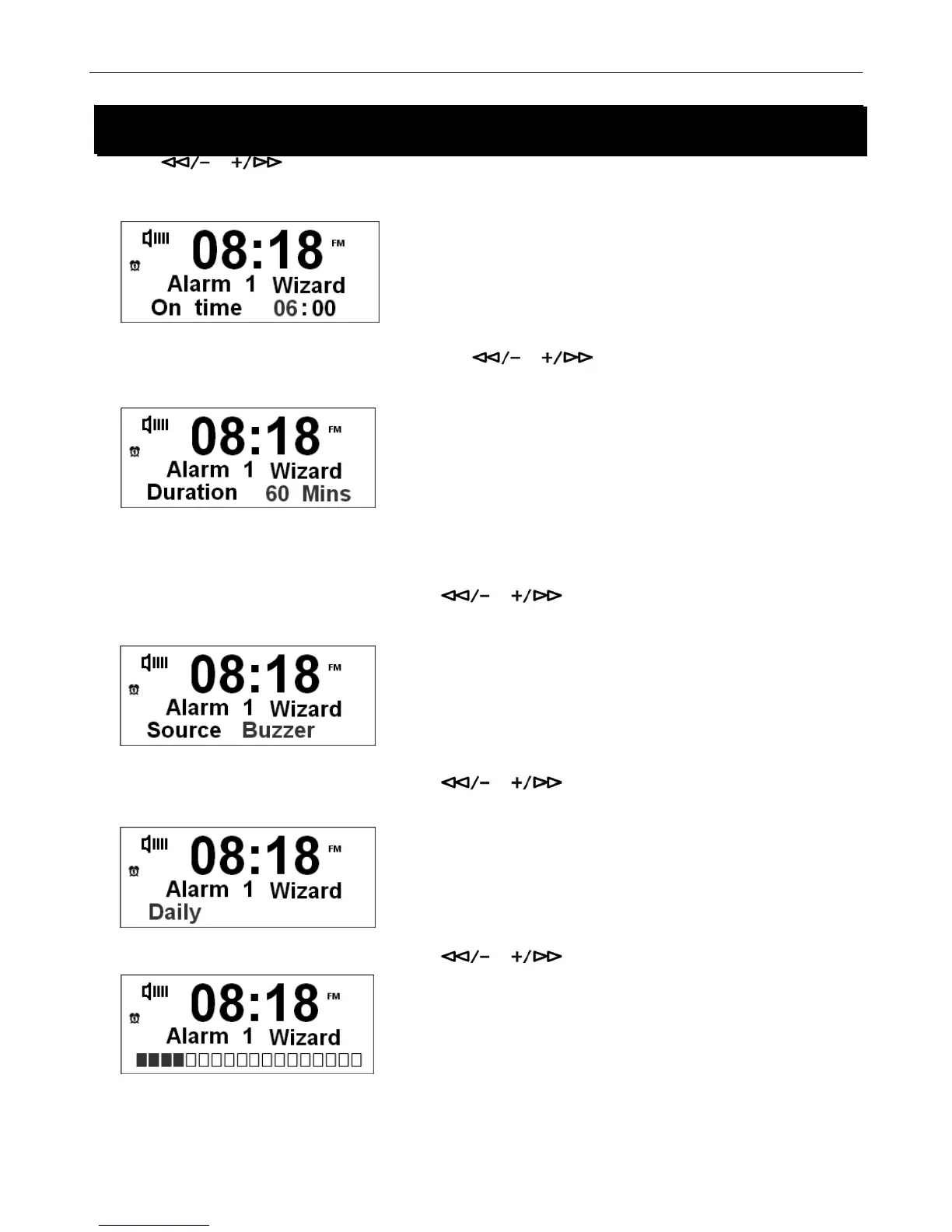 4. To set Alarm time, refer to setting clock time, on page 20.