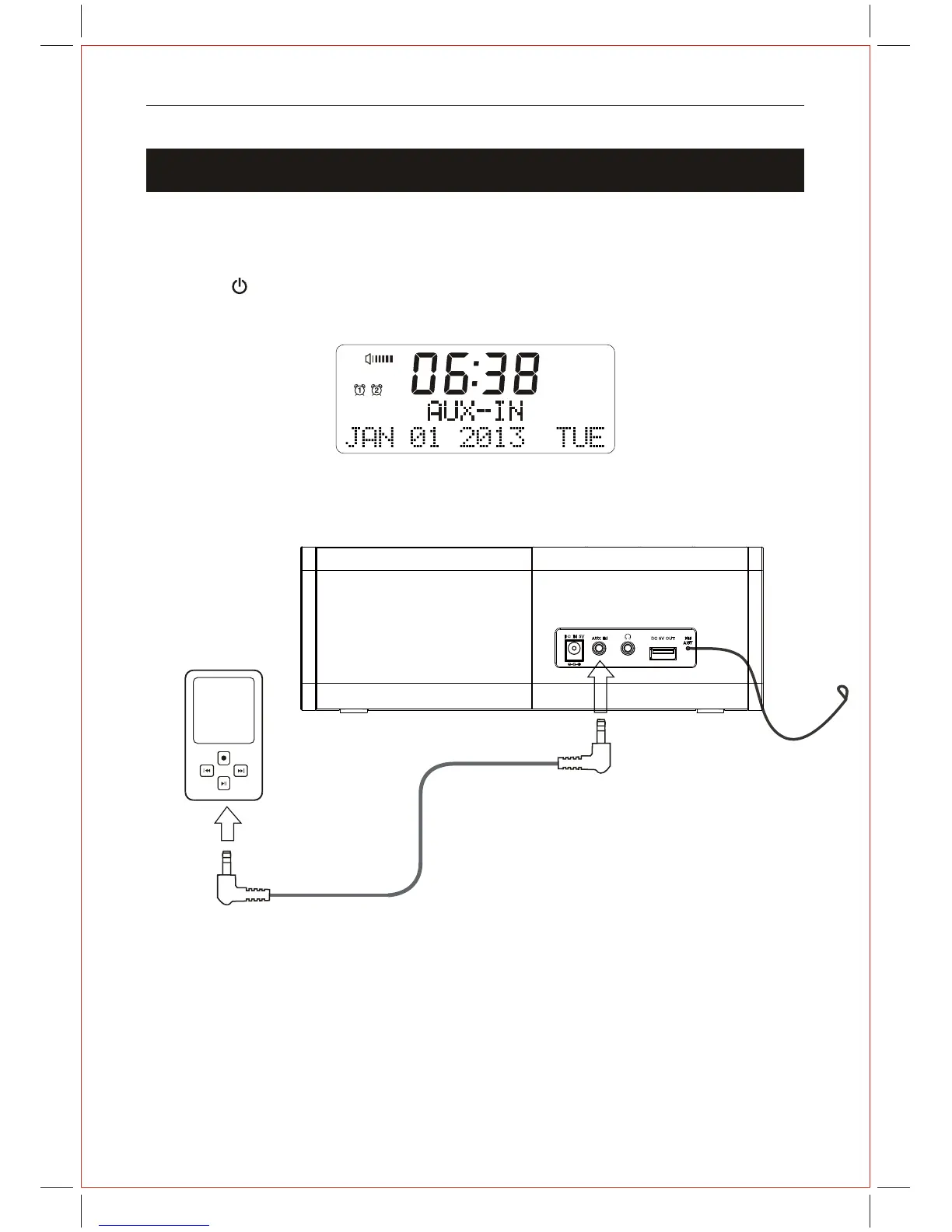 Connect a 3.5mm stereo audio lead (not included) to the AUX-IN socket on the unit and