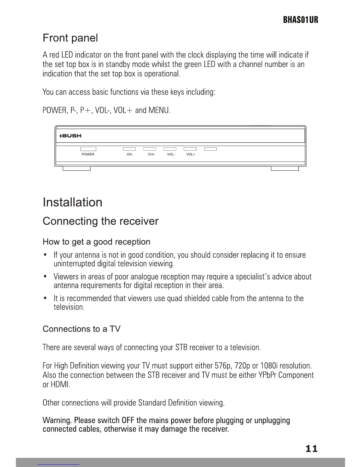 Bush BHAS01UR - Front Panel Features; Installation Guide; Connecting the Receiver