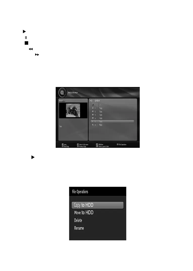 Blue Button (File Operations): Displays options of DeleteRenameMove to HDDCopy to HDD. Press