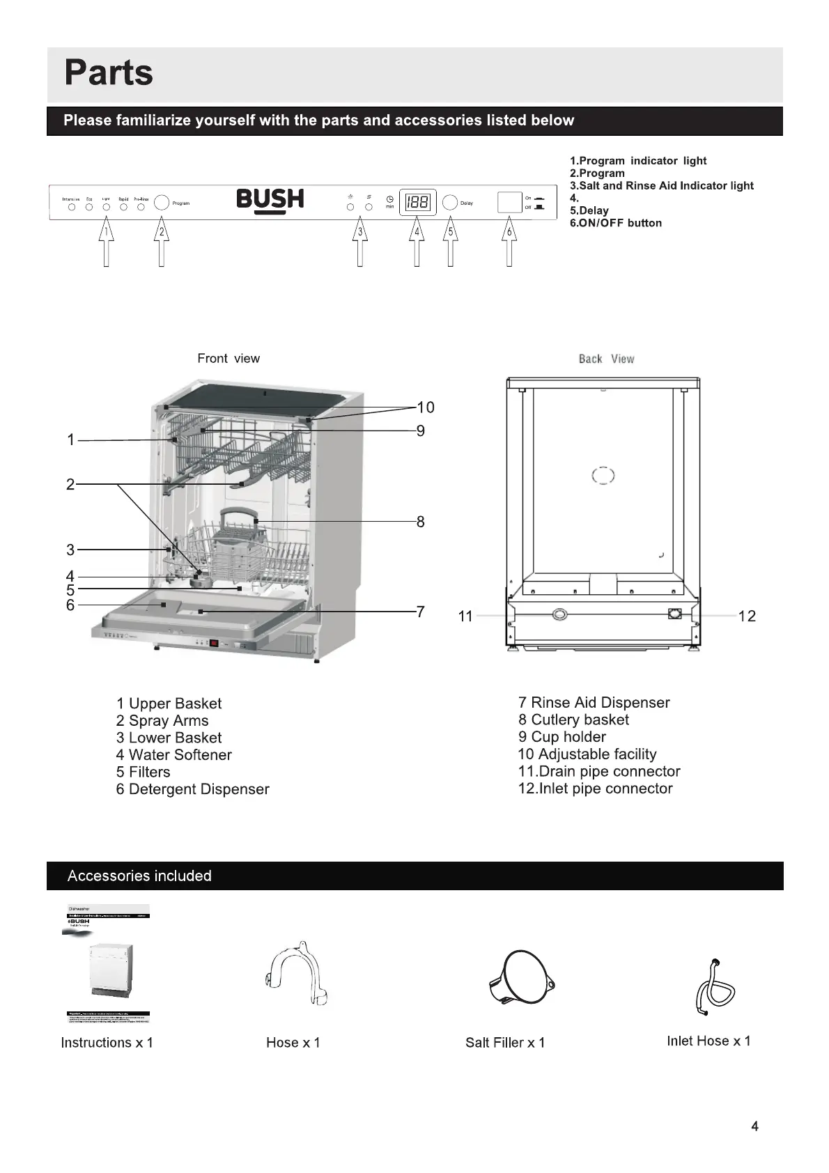 Bush DWFS125W - Parts; Front view; Back View; Accessories included