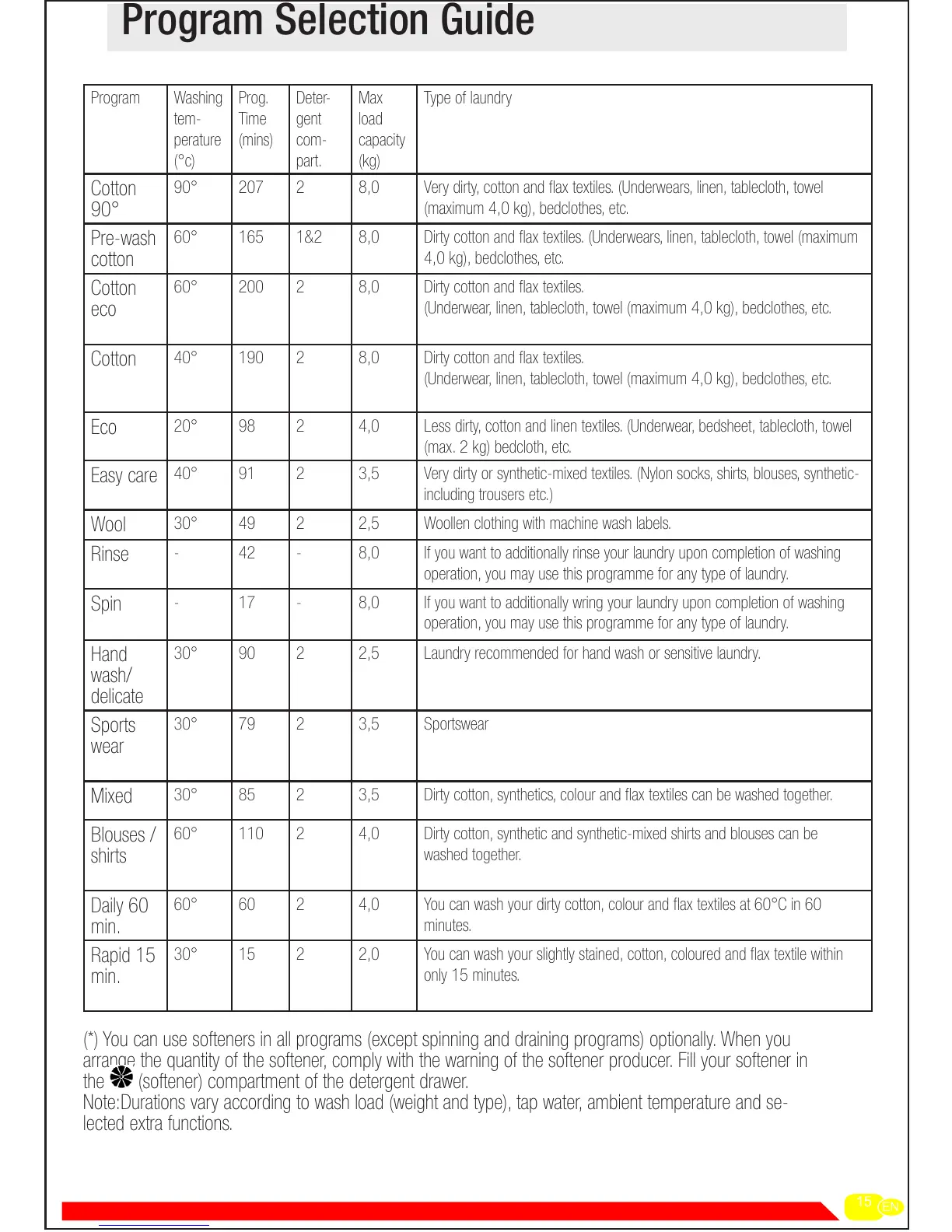 (*) You can use softeners in all programs (except spinning and draining programs) optionally. When you