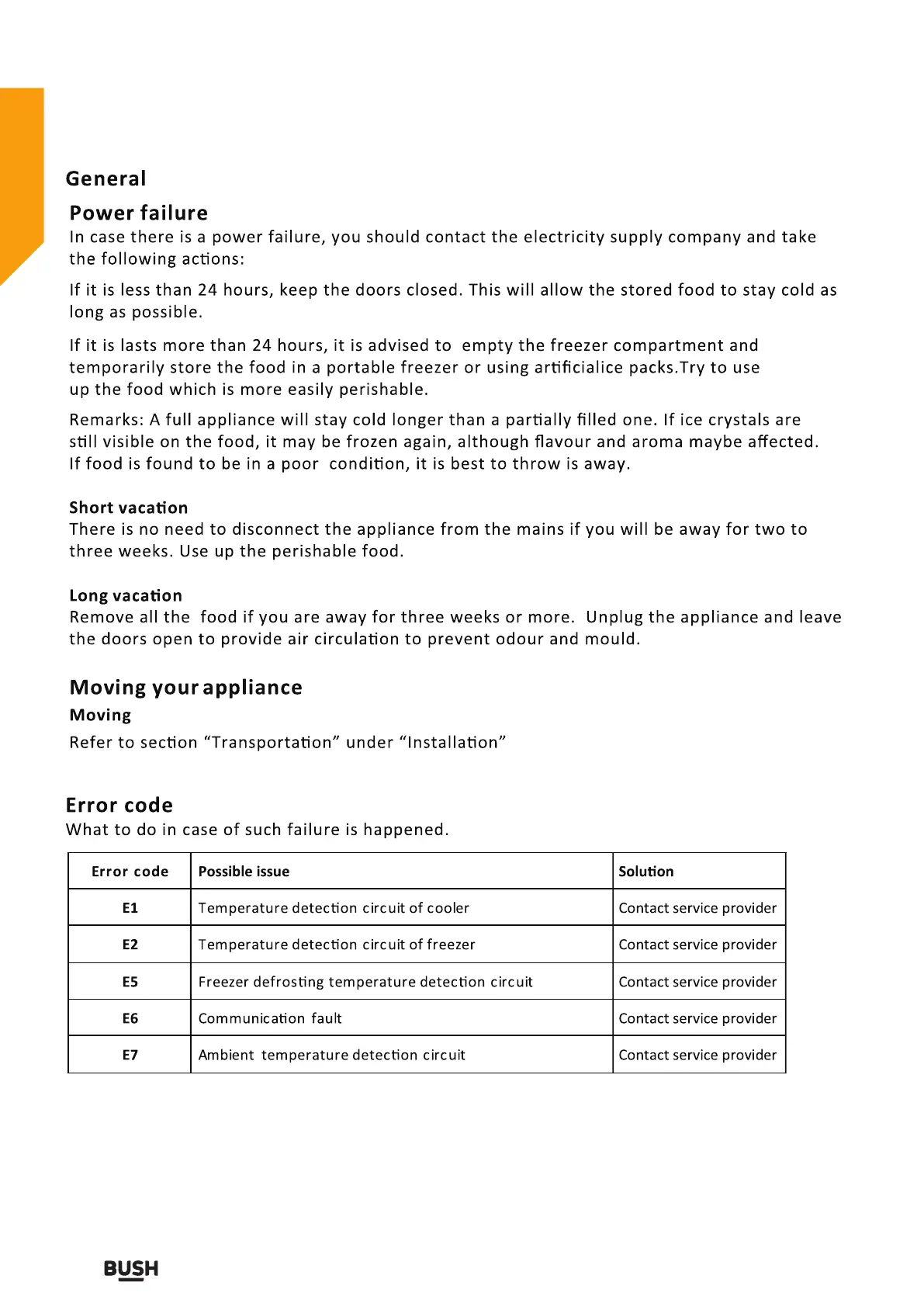 Bush MSBSB20 - Power failure; Moving your appliance