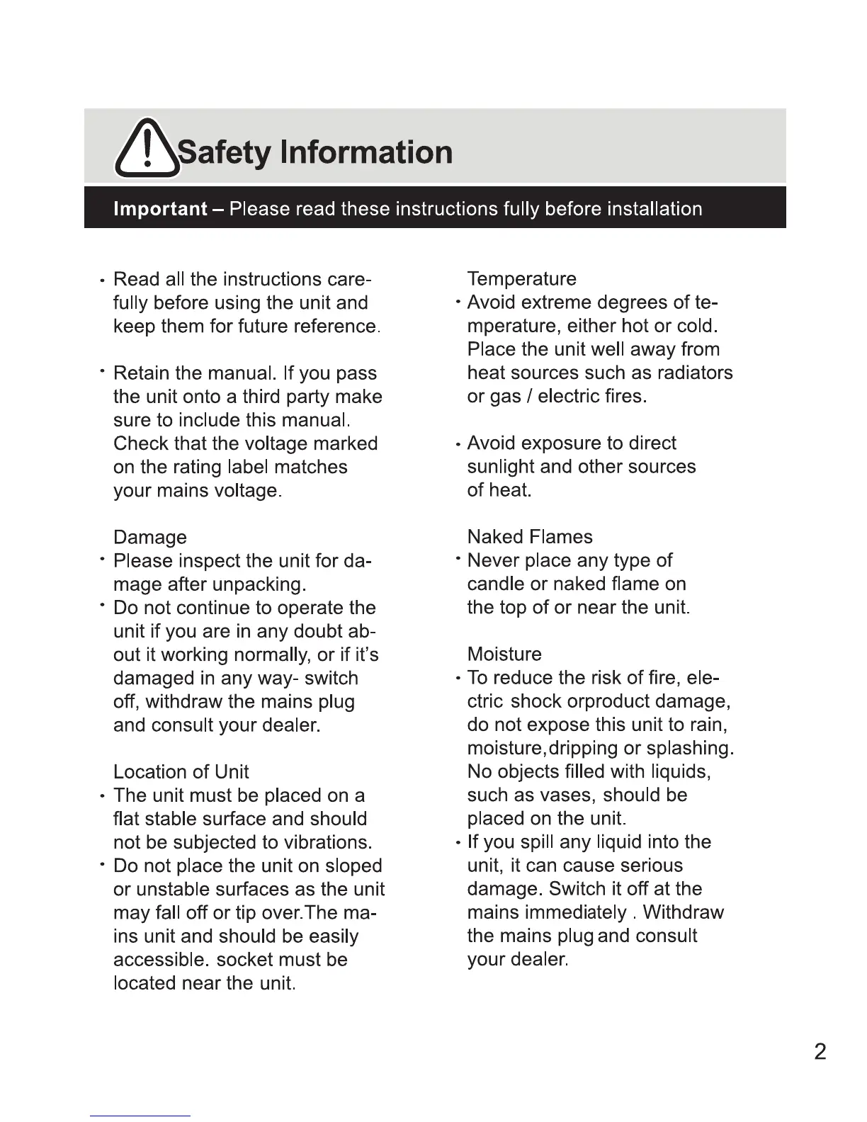 Bush SPK310 - Safety Information; Damage and Location; Temperature, Flames, and Moisture Precautions