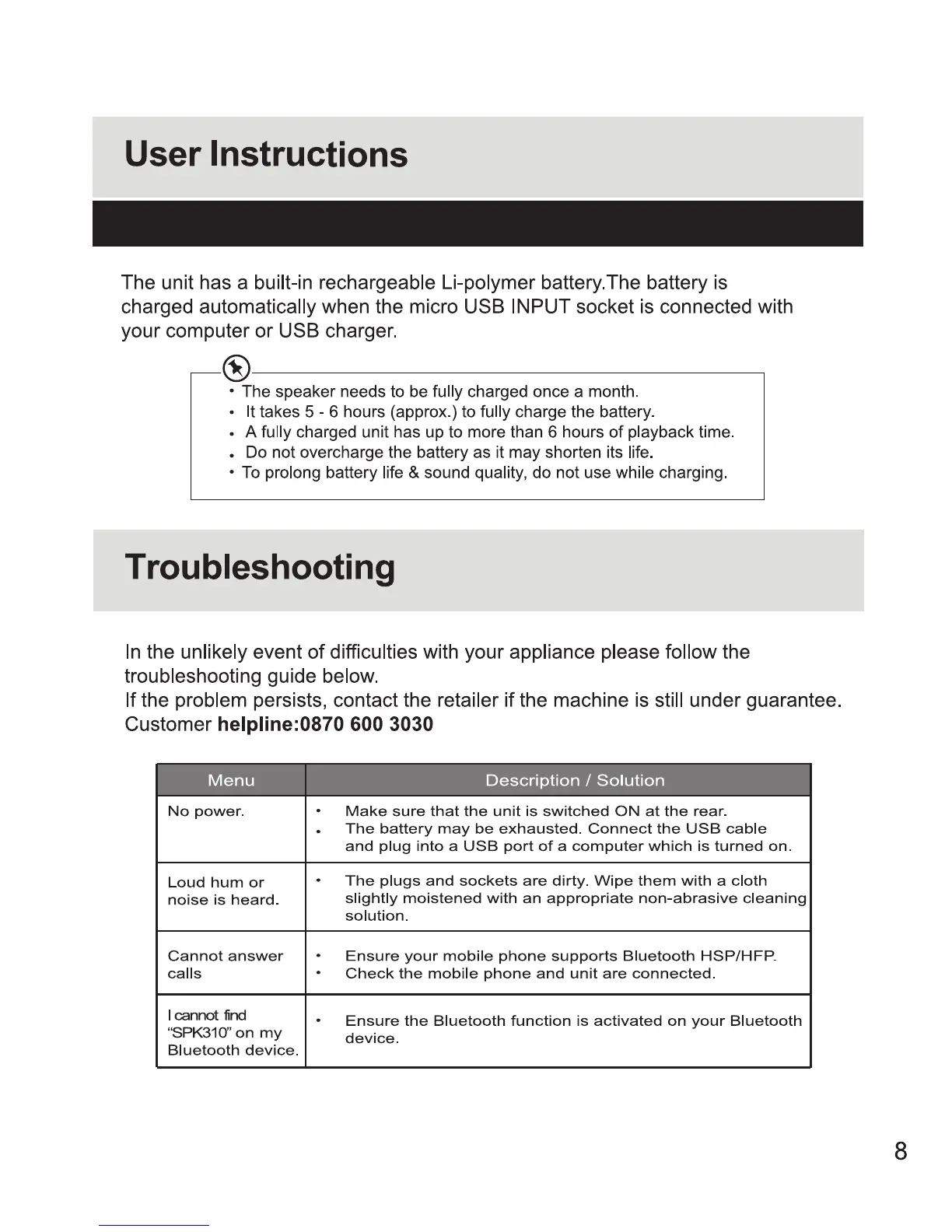 Bush SPK310 - Cautionary Notes; Troubleshooting; Common Issues and Solutions
