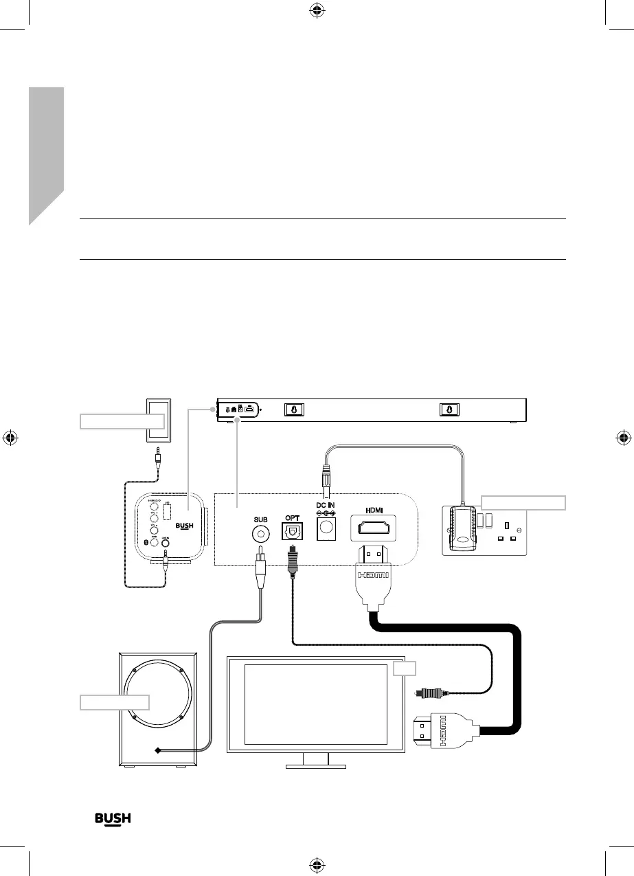 socket on the back of the Soundbar and then plug the power adaptor into the mains