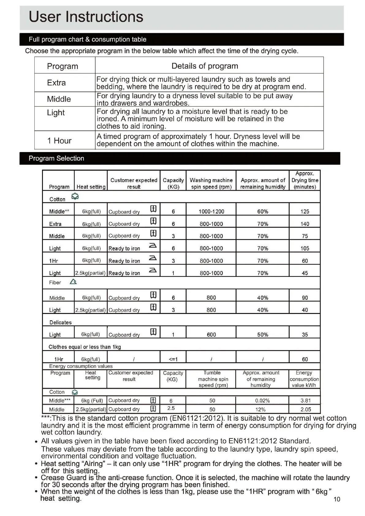Bush TDV6B - Program Chart and Consumption Data; Program Selection Guidance