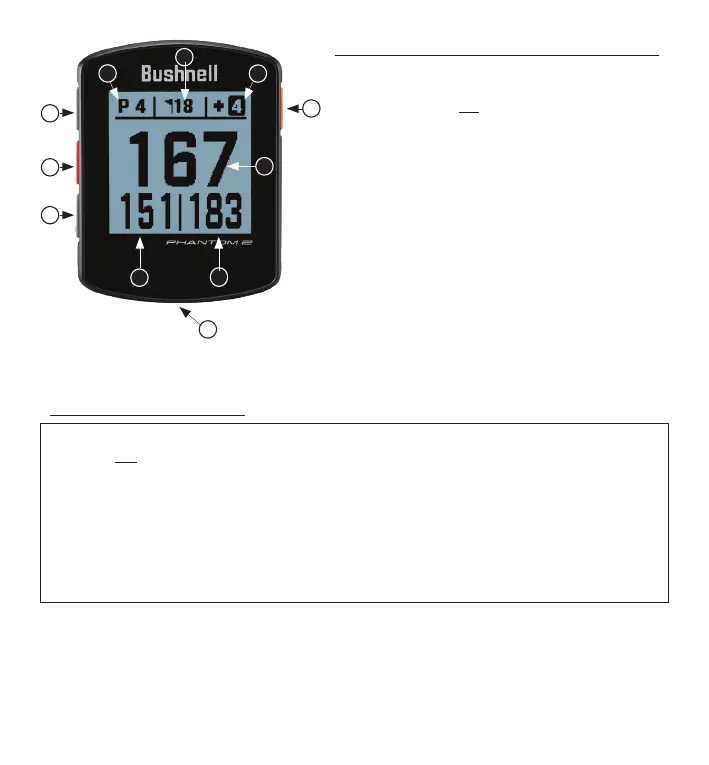 6. To cycle through mode/menu screens (Front/Center/Back > Greenview > Hazards and Layup points > Time >