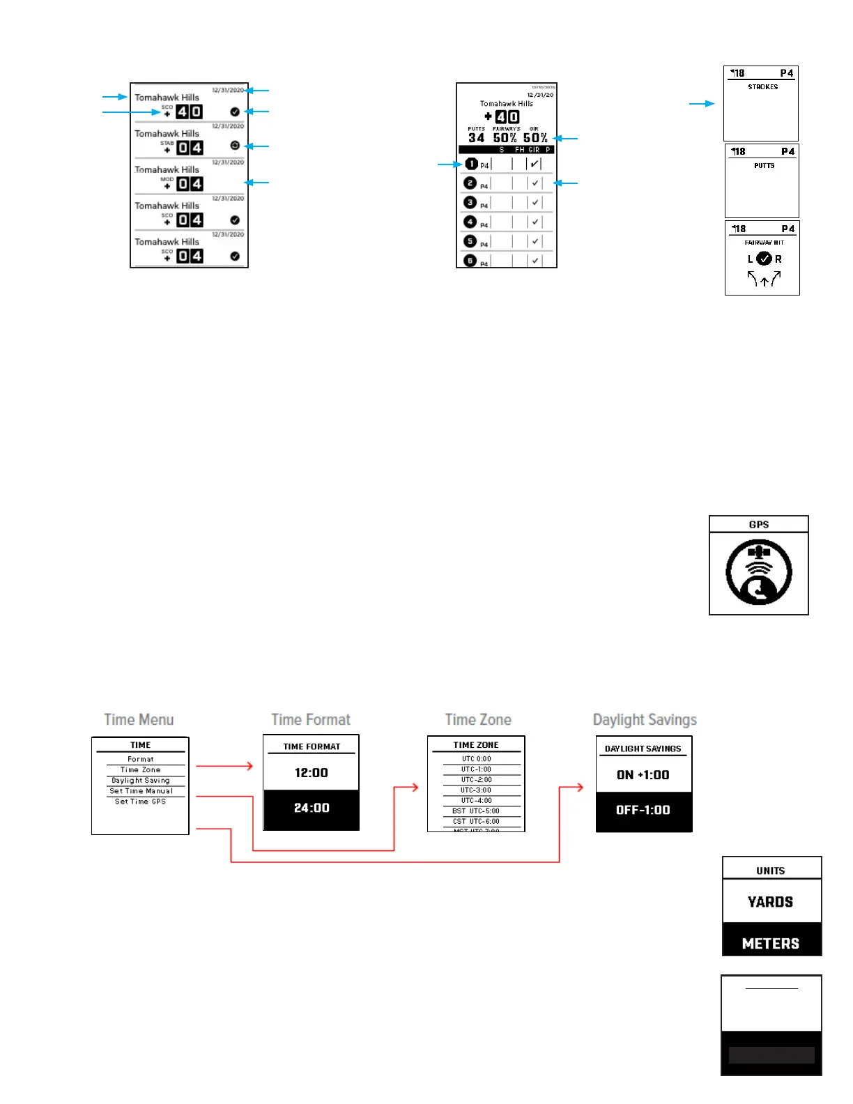 AKKU*: Drücken Sie die AUSWAHL-Taste, um den Akkustatus zu überprüfen (Ladung %). (*wird auch im Menü GOLF SPIELEN angezeigt)