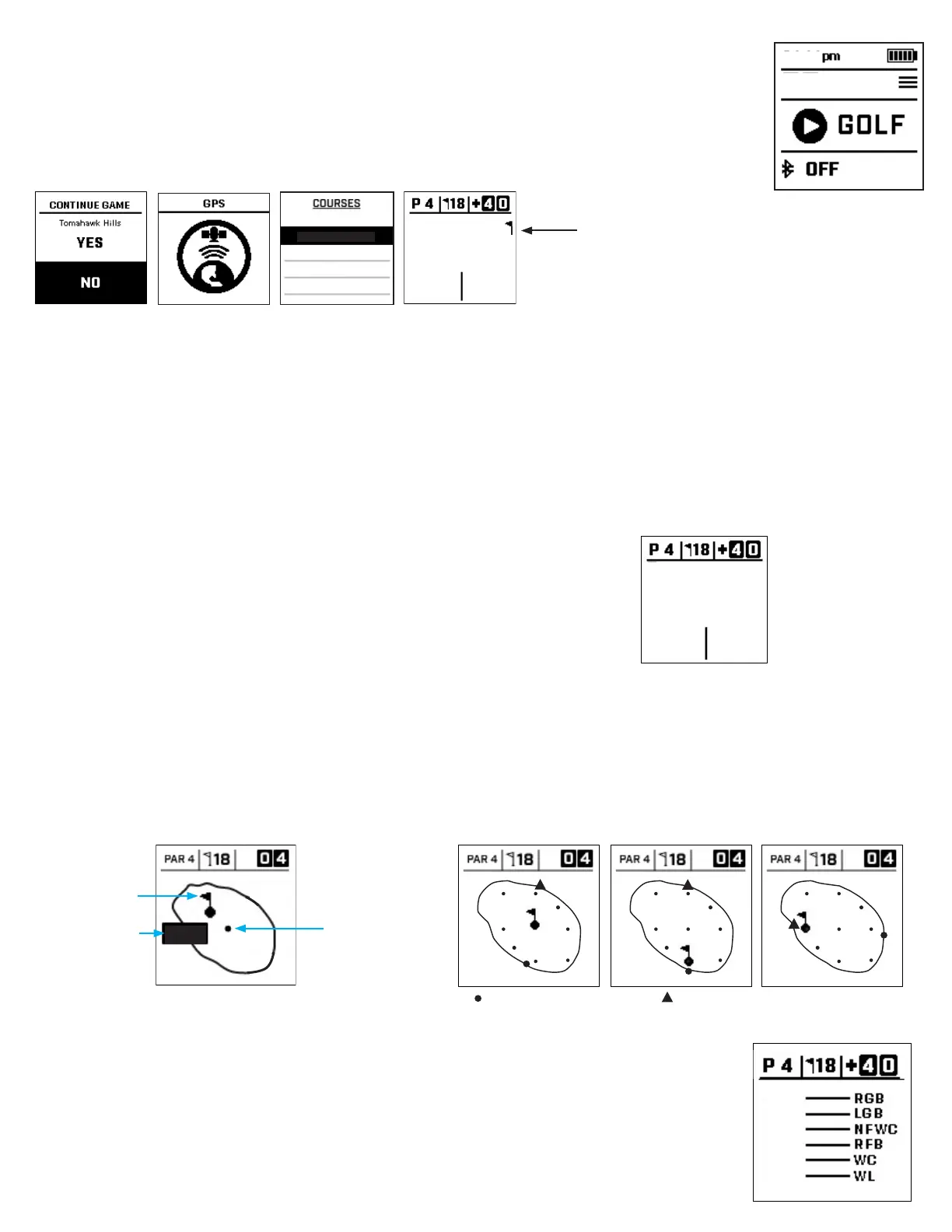 punteggio della partita (Fig. 9), distanza dal tee (Fig. 10), distanza dalla parte anteriore del green (Fig. 11) e distanza dalla parte posteriore del green