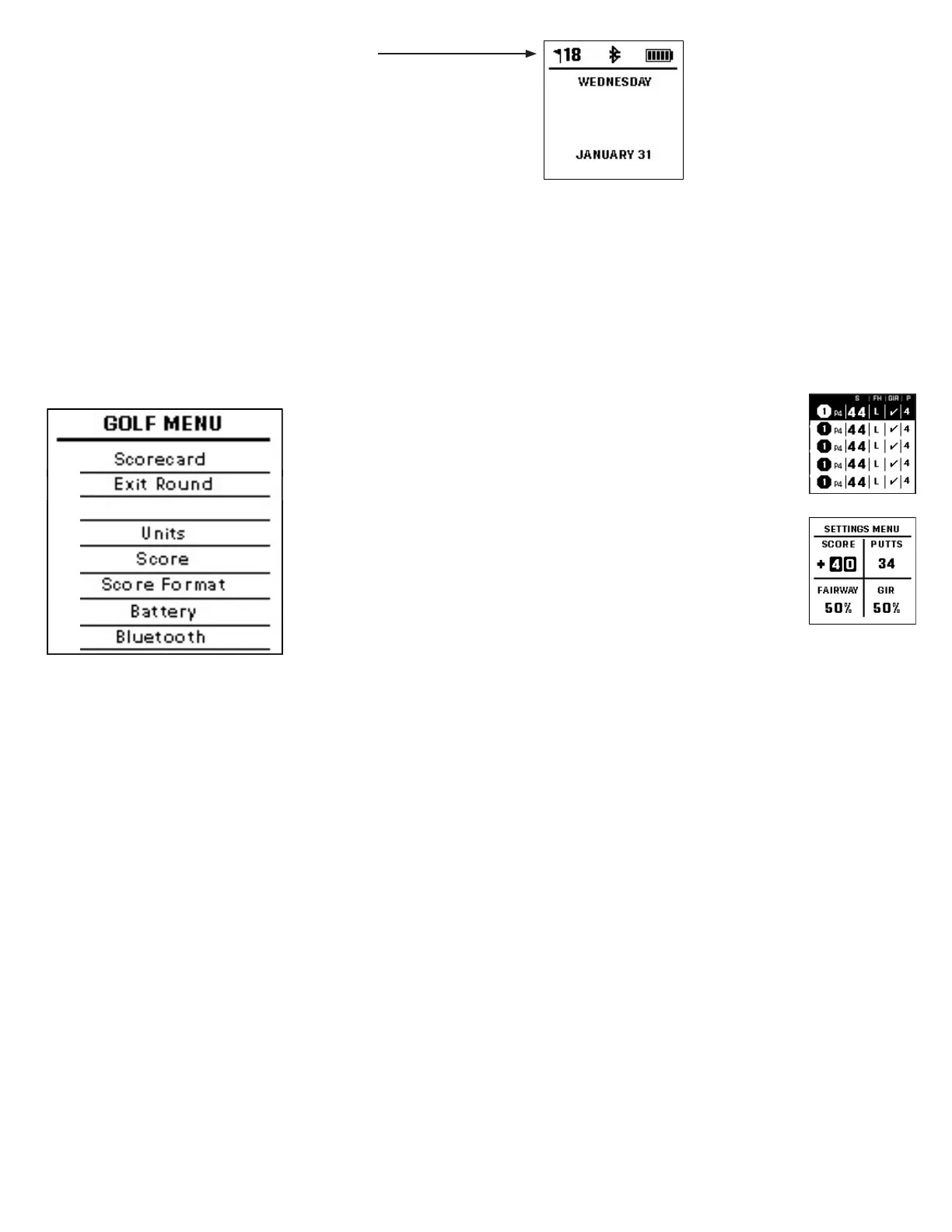 (mitt på vänster sida av enheten). Ange antal puttar på nästa skärm och tryck på NÄSTA-knappen igen för att fylla i skärmen för fairway-