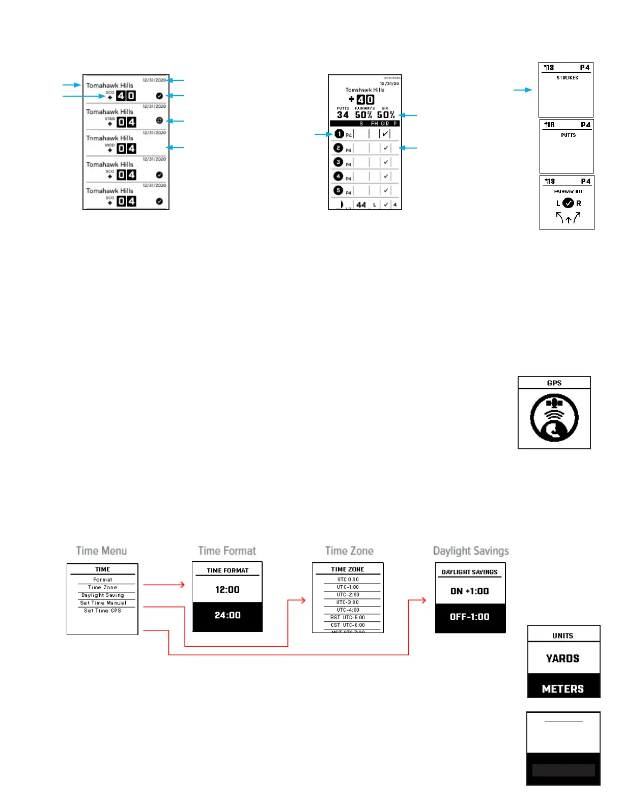 Untuk mengubah satuan jarak, soroti YARD atau METER, tekan PILIH. (*juga ada di Menu MAIN GOLF)