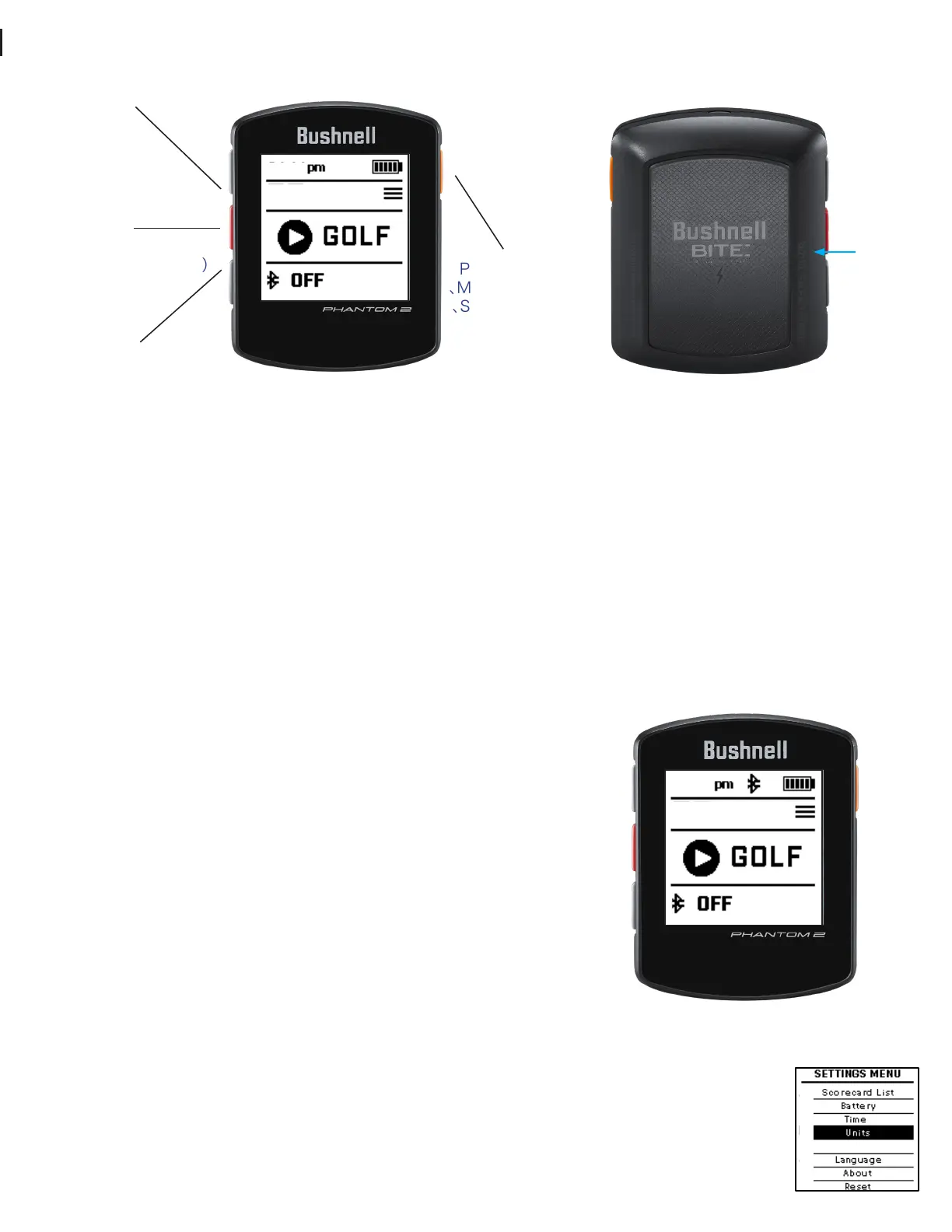 1. ホーム画面で(1)[SETTINGS](設定)を押し([PLAY GOLF](プレー)モードの場合は [MENU] (メニュー)を押して