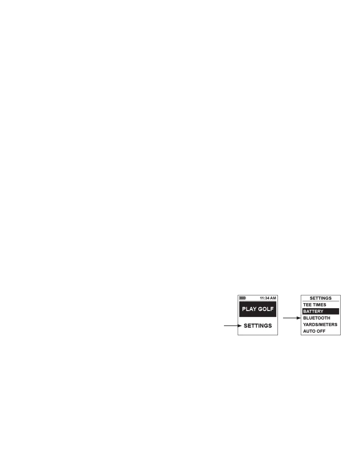 • BATTERY*: press SELECT button to check battery condition (charge %). (*also provided in the PLAY GOLF Menu)