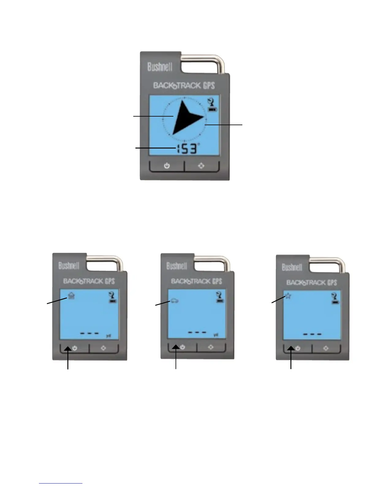 3. La primera vez que lo enciende, el BackTrack se pone en marcha en modo de Brújula. Una flecha apunta al Norte