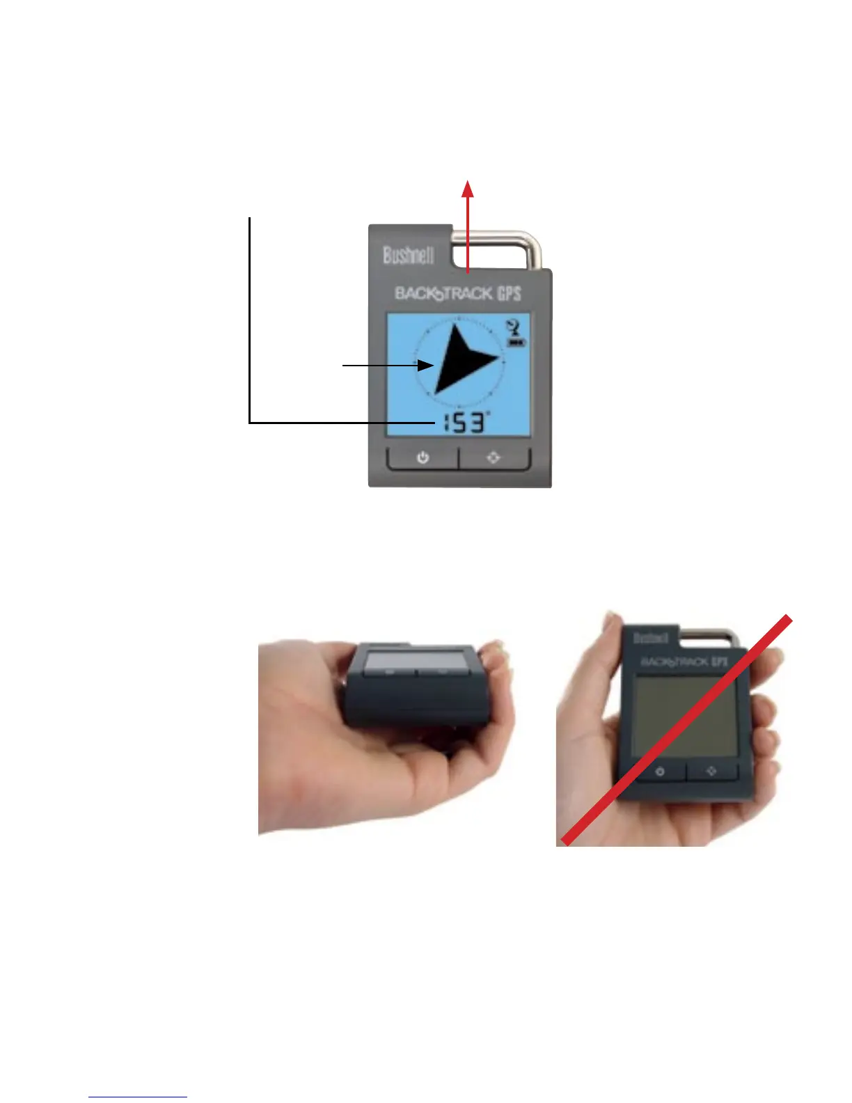 Para asegurar la precisión de dirección, sujete el BackTrack horizontalmente delante de usted (paralelo al suelo) y