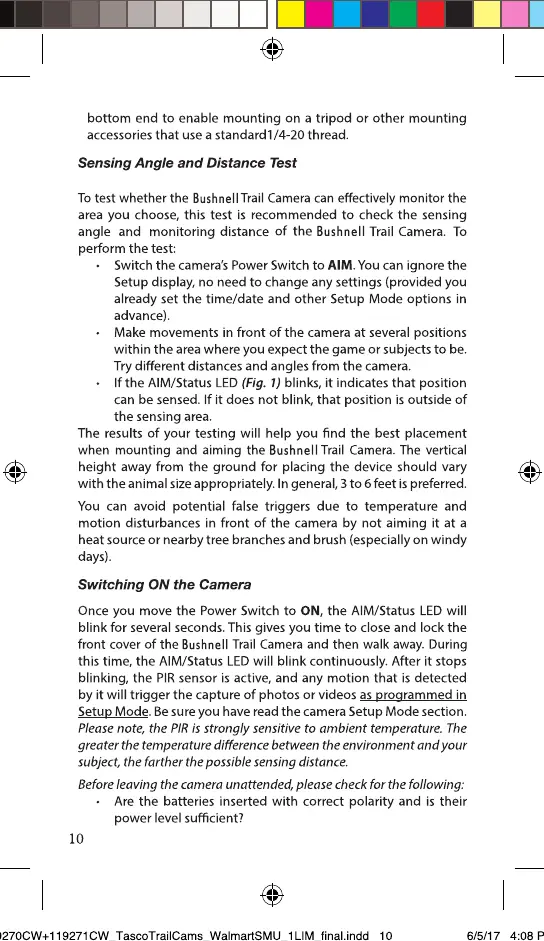 Bushnell 66061A - Camera Operation and Testing (Part 1); Sensing Angle and Distance Test; Initializing Camera Operation; Pre-Operation Checks