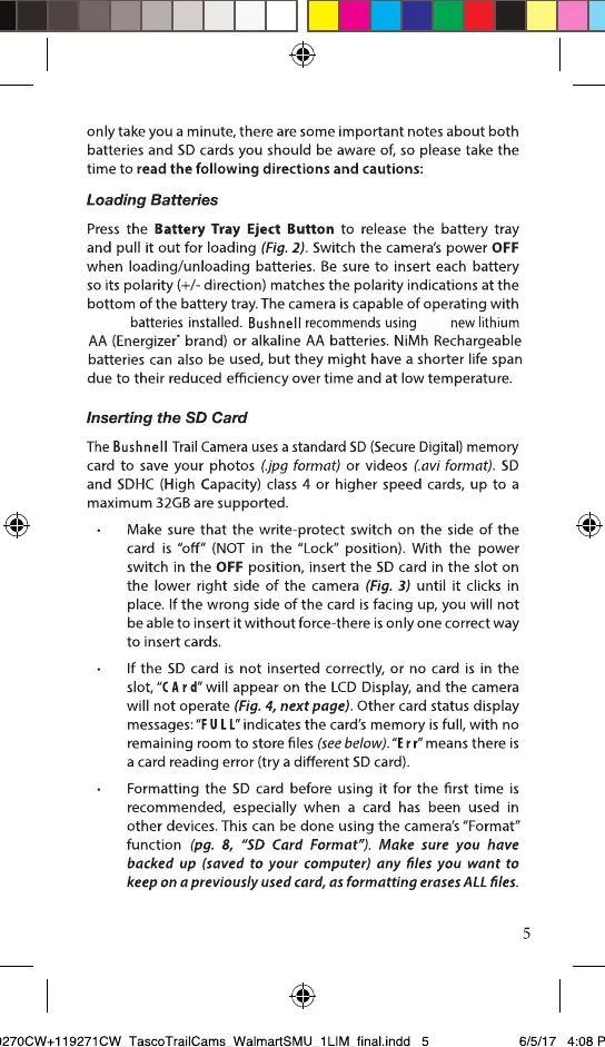 Bushnell 66061A - Installation Guide: Batteries and SD Card; Loading Batteries; Inserting the SD Card; Formatting the SD Card