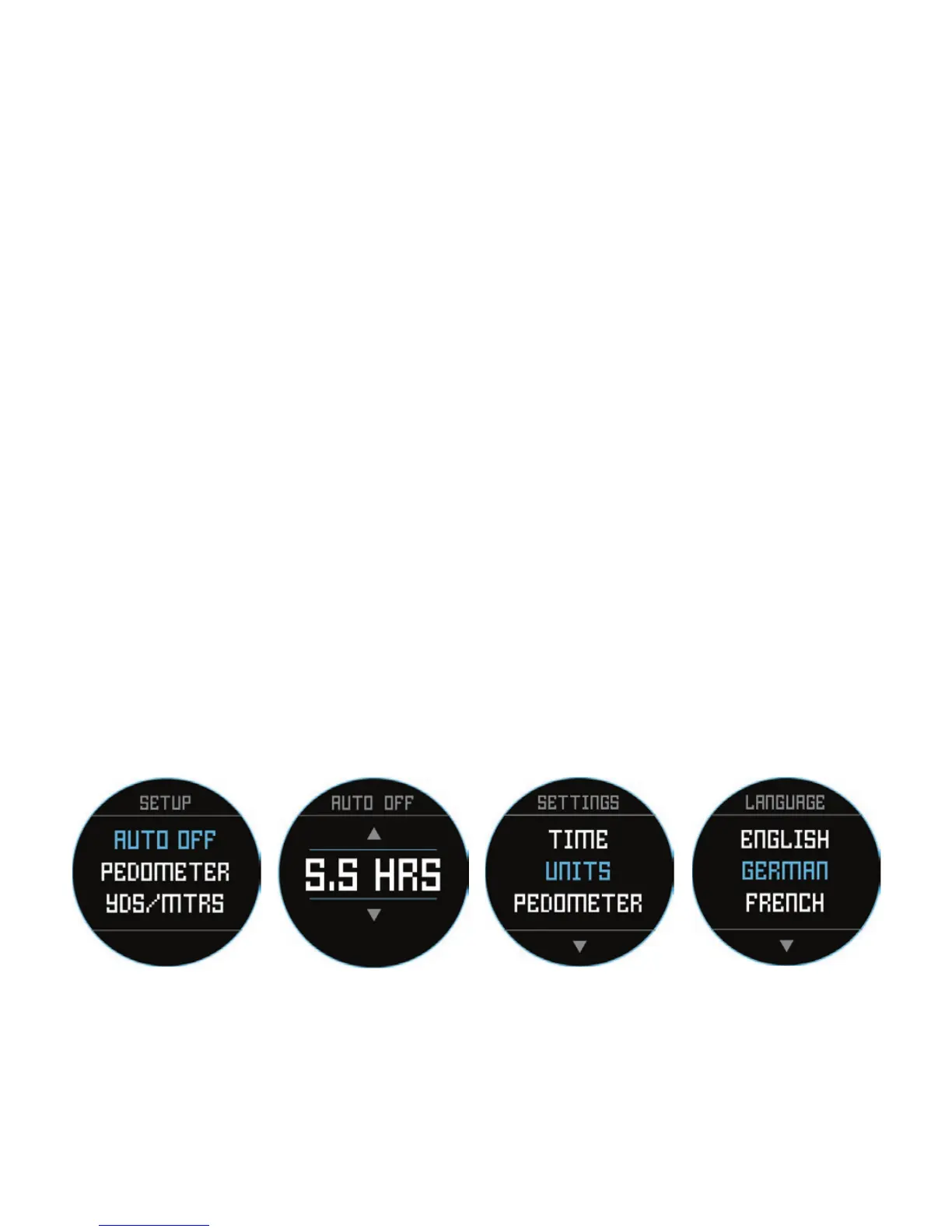 Play Golf (yardas o metros), establecer una hora de apagado automático, congurar el podómetro mientras esté en modo