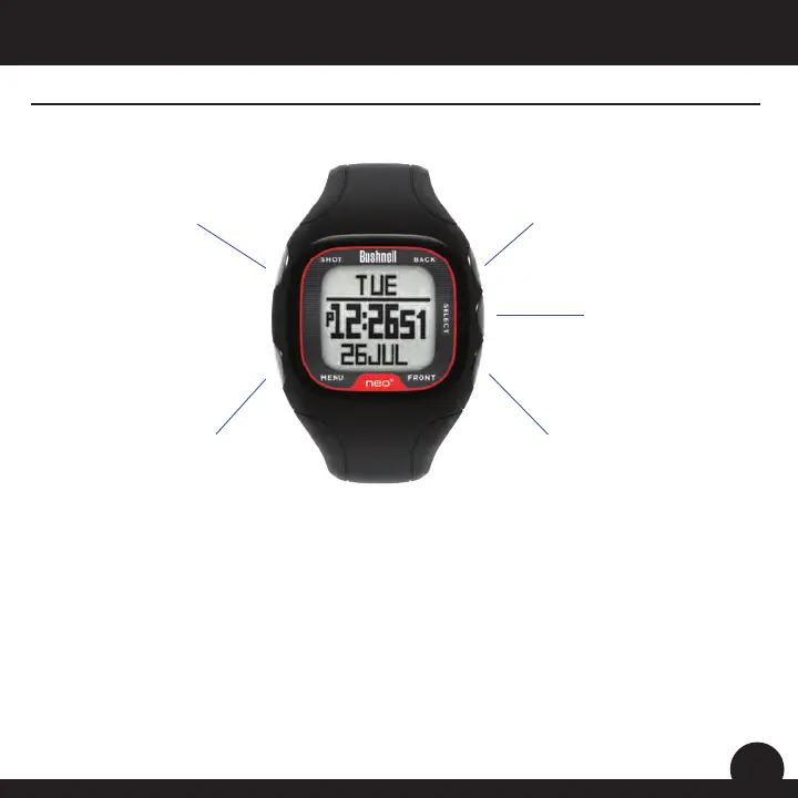 1. SHOT Button: Tracks shot distance in Play Golf mode. Controls backlight. Press &