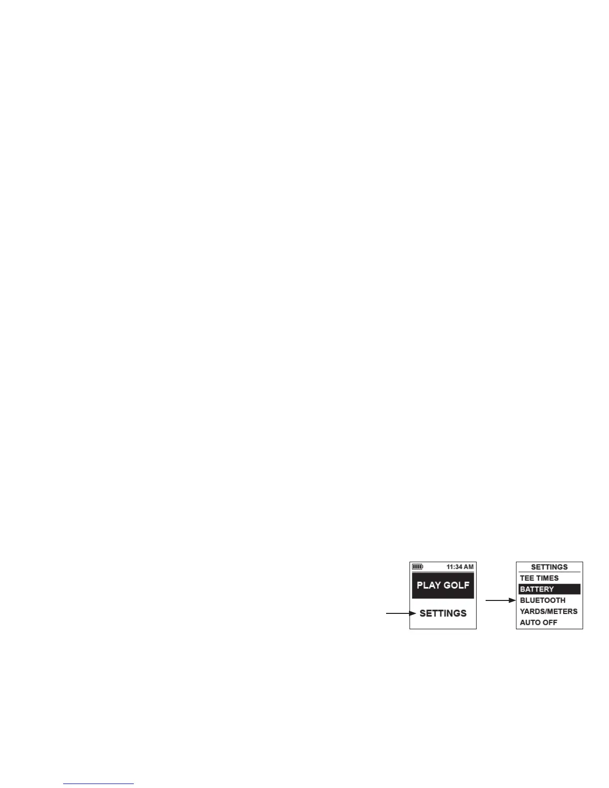 • AKKU*: Drücken Sie die AUSWÄHLEN-Taste, um den Akkuzustand zu überprüfen (Ladung %). (* auch im GOLF SPIELEN-Menü vorhanden)