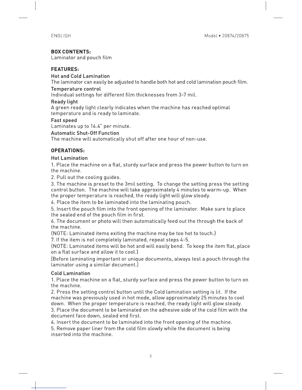 Business Source 20875 - Box Contents; Product Features; Hot and Cold Lamination; Temperature Control