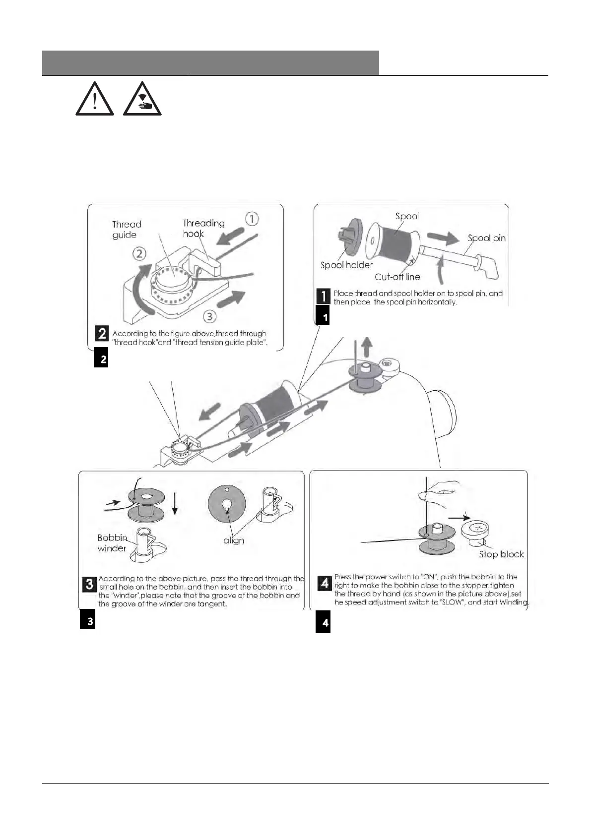 Tekan sakelar daya ke "ON", dorong bobbin ke kanan