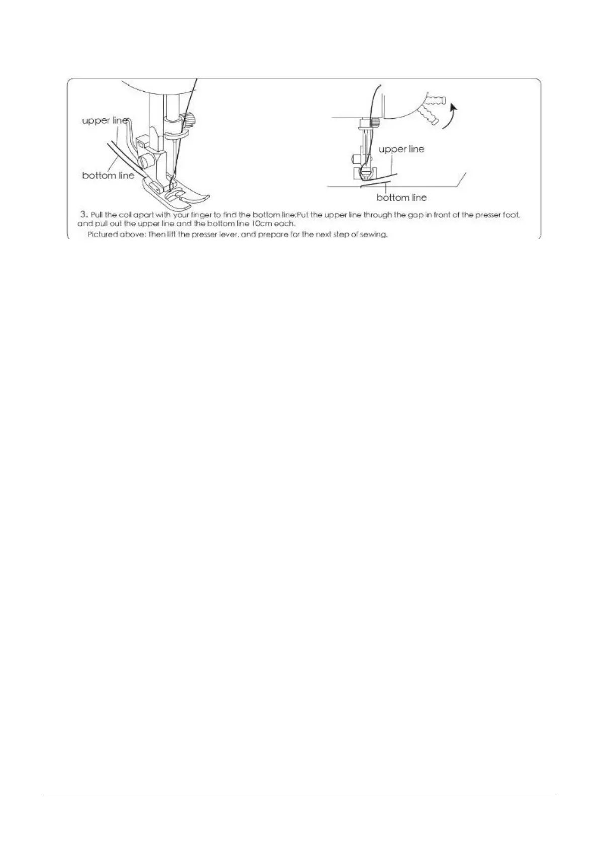 Digambarkan di atas; Kemudian angkat tuas penekan, dan persiapkan untuk langkah menjahit selanjutnya.